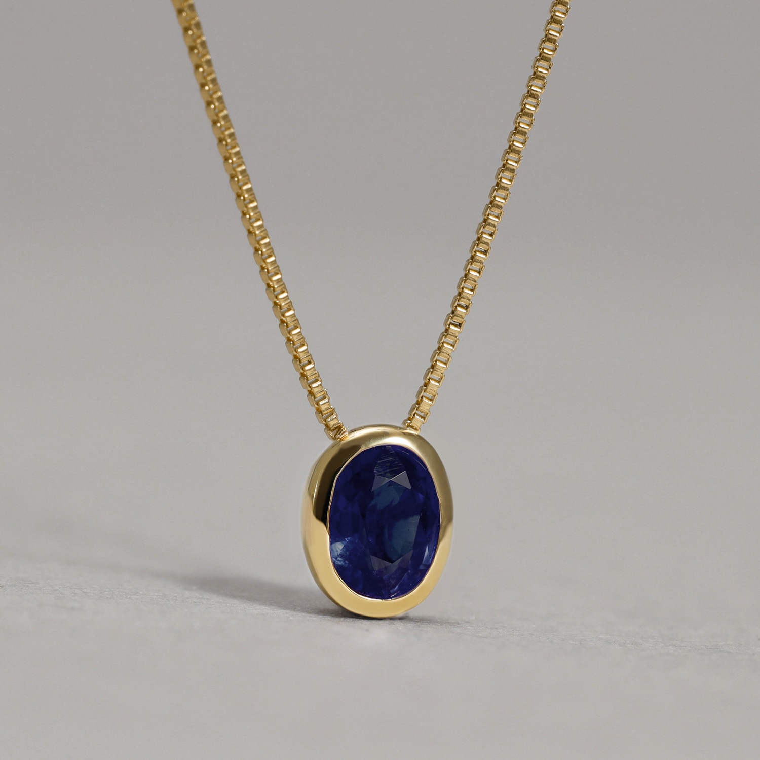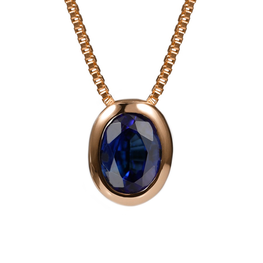 0.2カラットアップのロイヤルブルーサファイアを地金で丁寧に包み込んだベゼルセッティングのネックレス。