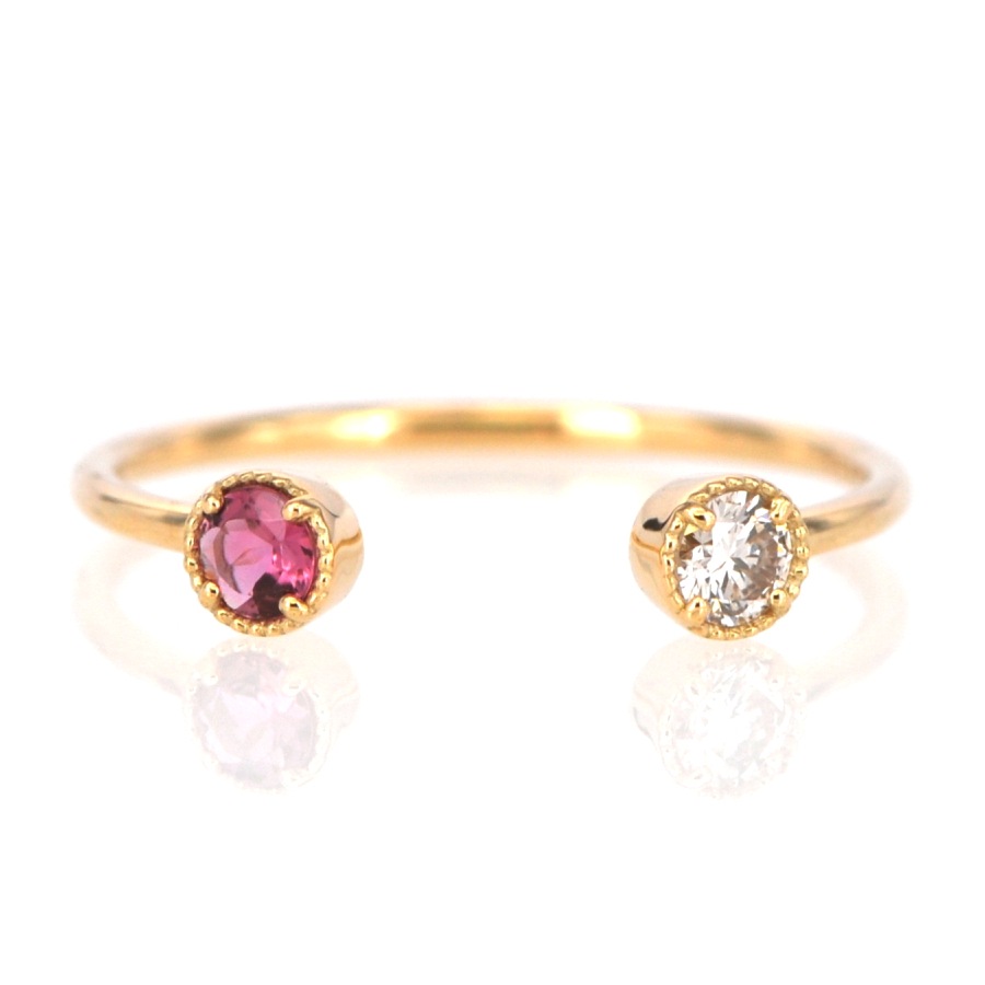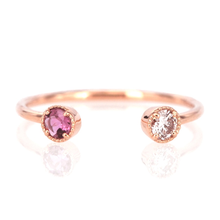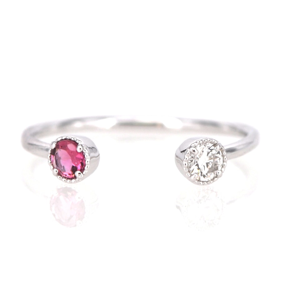 人気のフォークリングを同じサイズのダイヤモンドとピンクトルマリンを並べたシンプルなデザインで仕上げました。