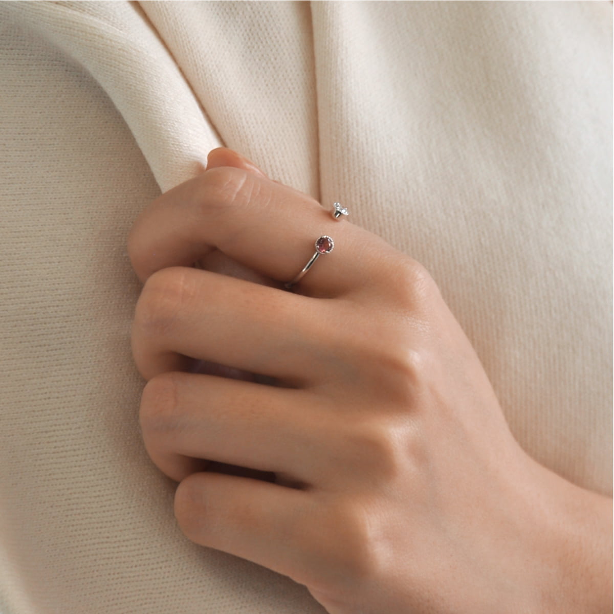リングのセンターがオープンになっていることでコーディネートに抜け感を生み、シンプルなデザインながら他の人と違ったオシャレを演出。