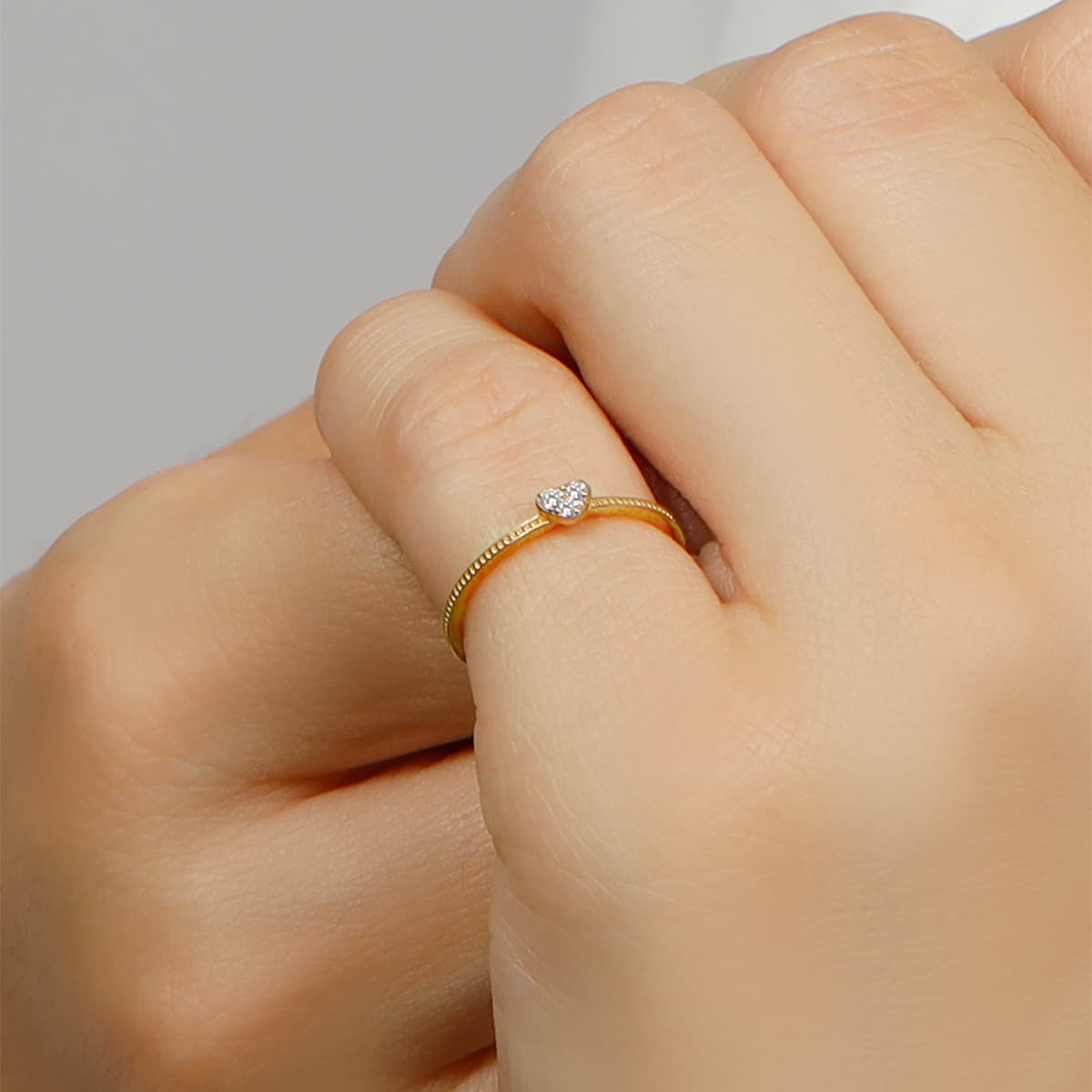 華奢なハートデザインは、さりげなくフェミニンさをプラス。小指にリングを嵌めることでコーディネートをより洗練された印象。