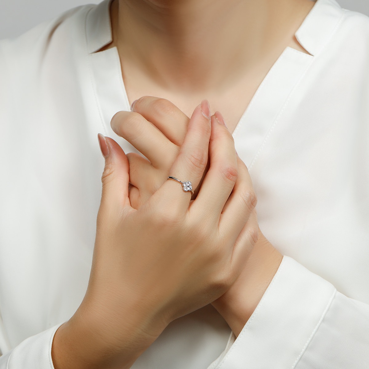 大人の女性にも合う上品で繊細な枠はキラキラと光り、ダイヤモンドをより大きく見せる効果も。