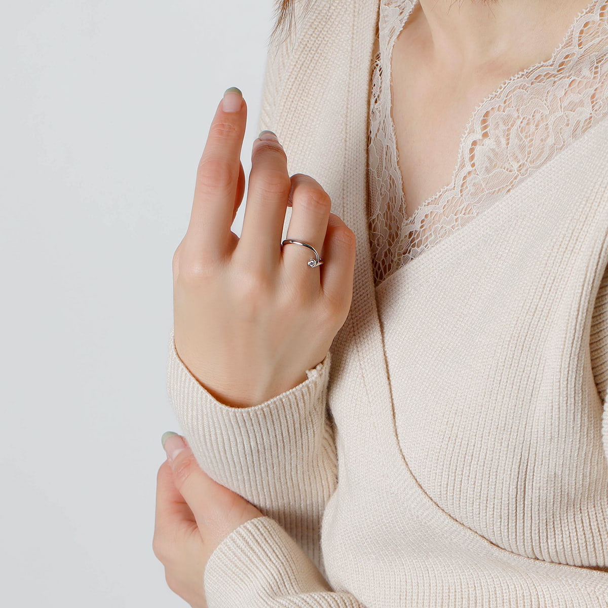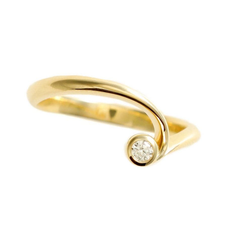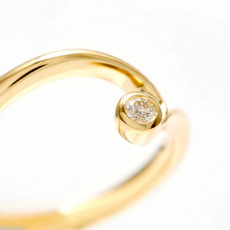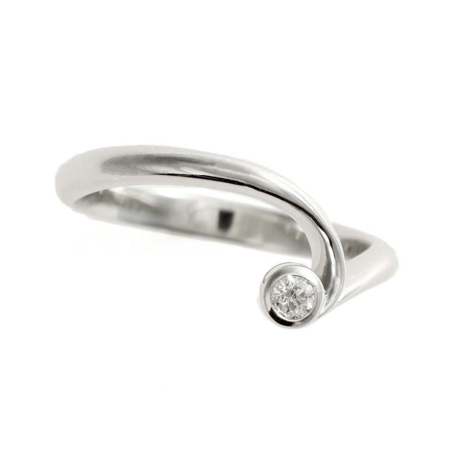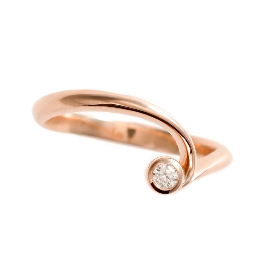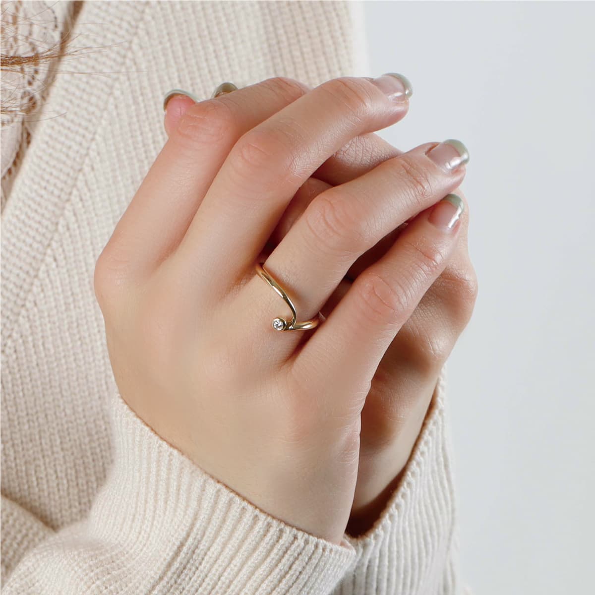 流れるようなカーブを描く地金ラインに、包まれるようにセッティングされたダイヤモンド1粒が際立つデザインリング。