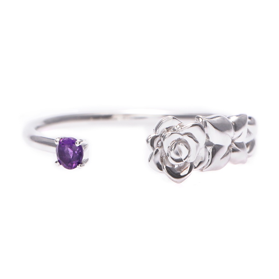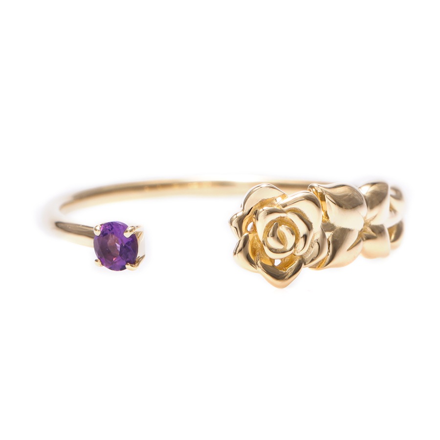 可愛らしく凛と咲く一輪のバラとラウンドカットのアメシストとのコントラストが素敵なフォークリング。輪の一部が途切れ、隙間が空いたような形のリングで、オープンリングとも呼ばれます。
