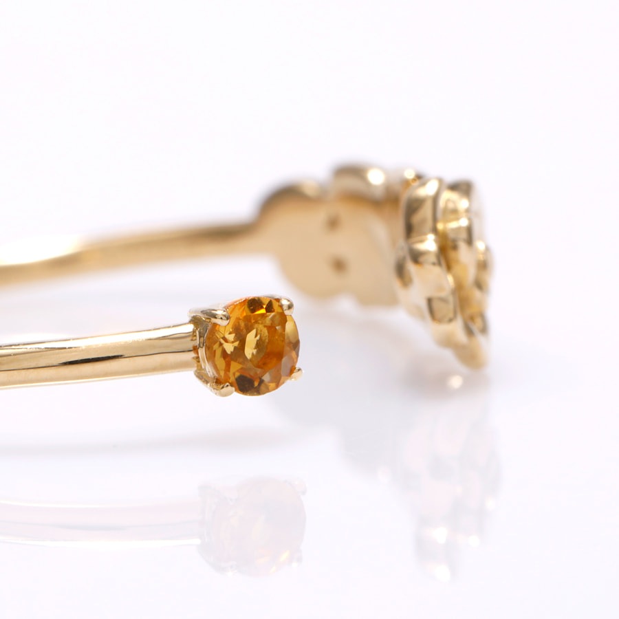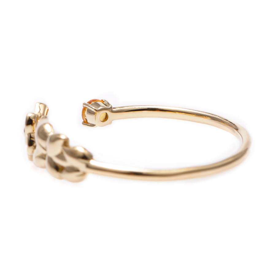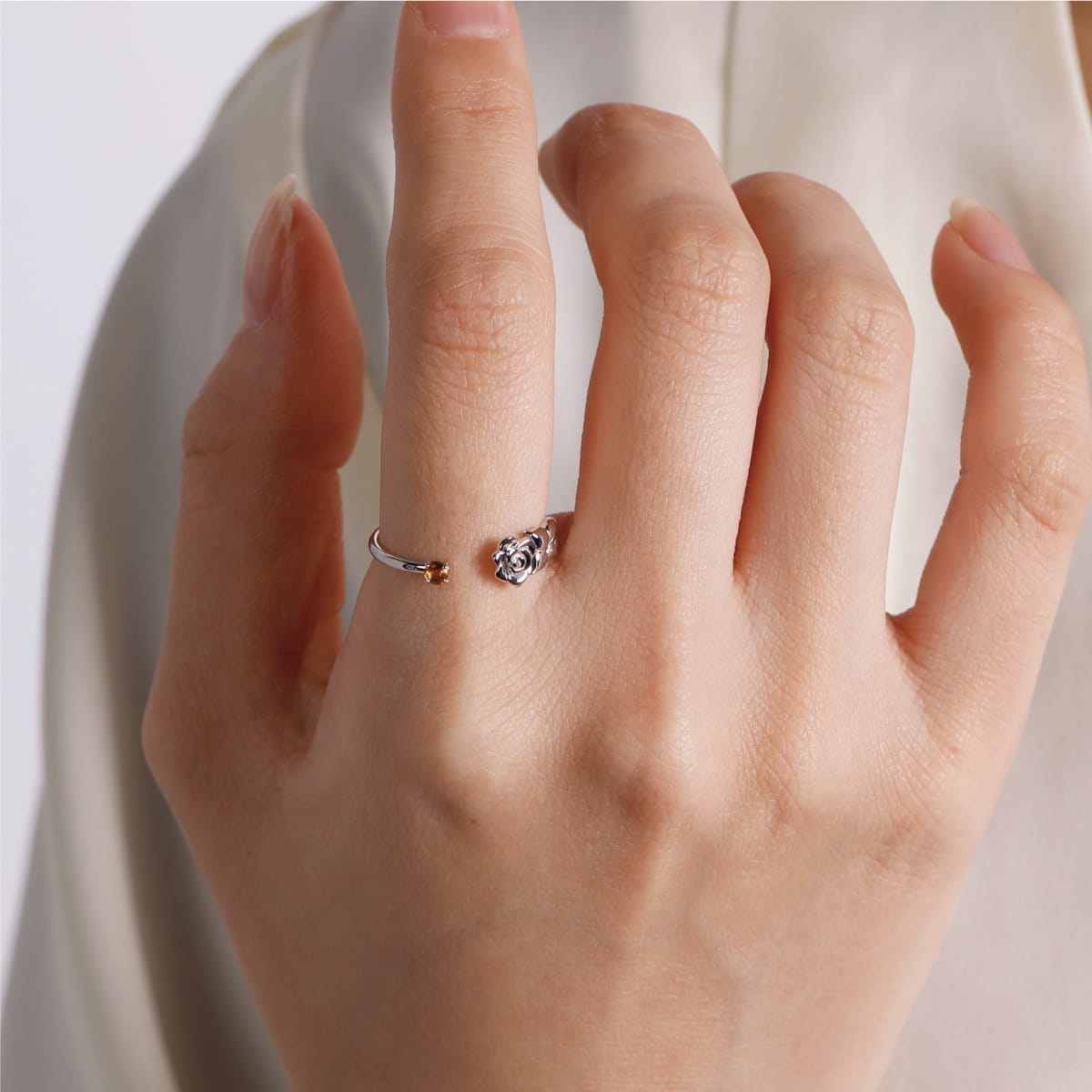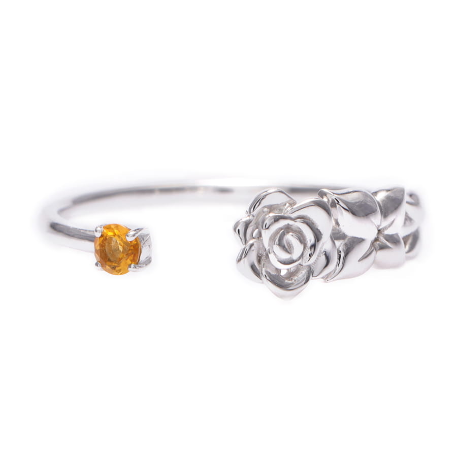 可愛らしく凛と咲く一輪のバラとラウンドカットのシトリンとのコントラストが素敵なフォークリング。輪の一部が途切れ、隙間が空いたような形のリングで、オープンリングとも呼ばれます。