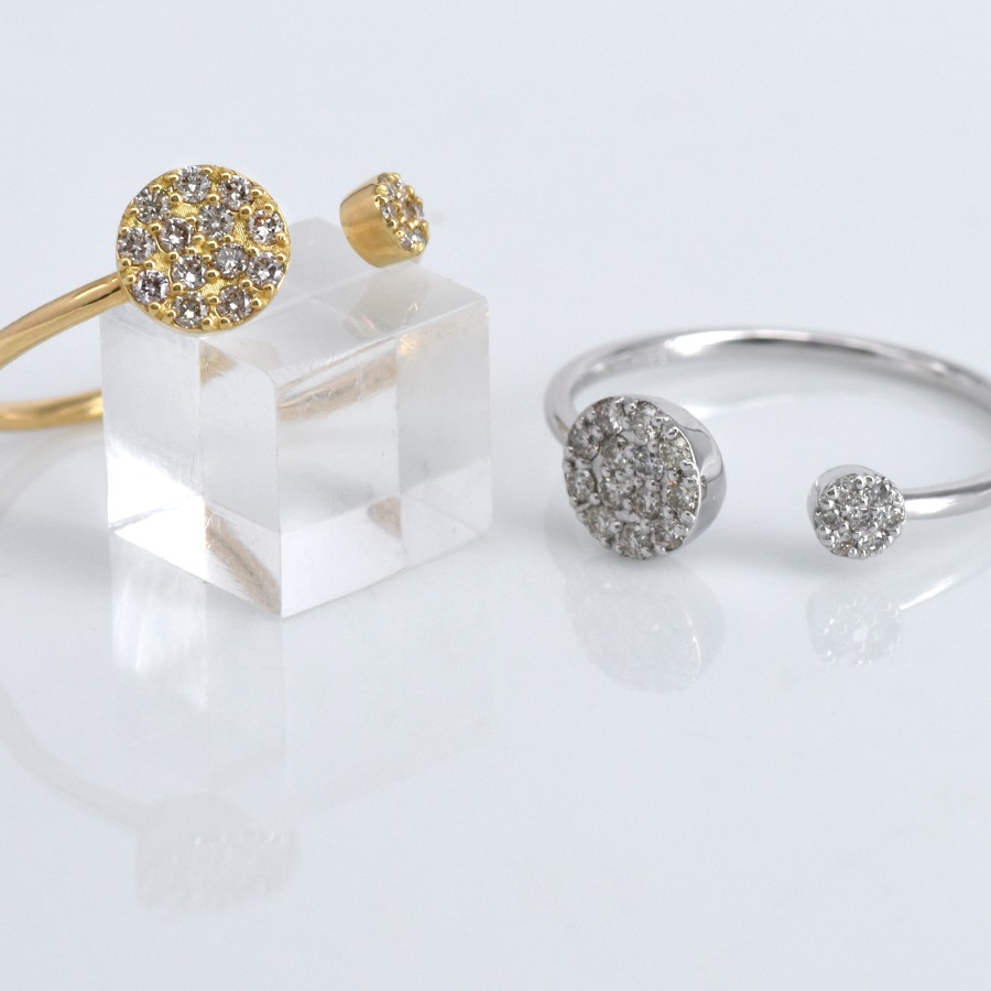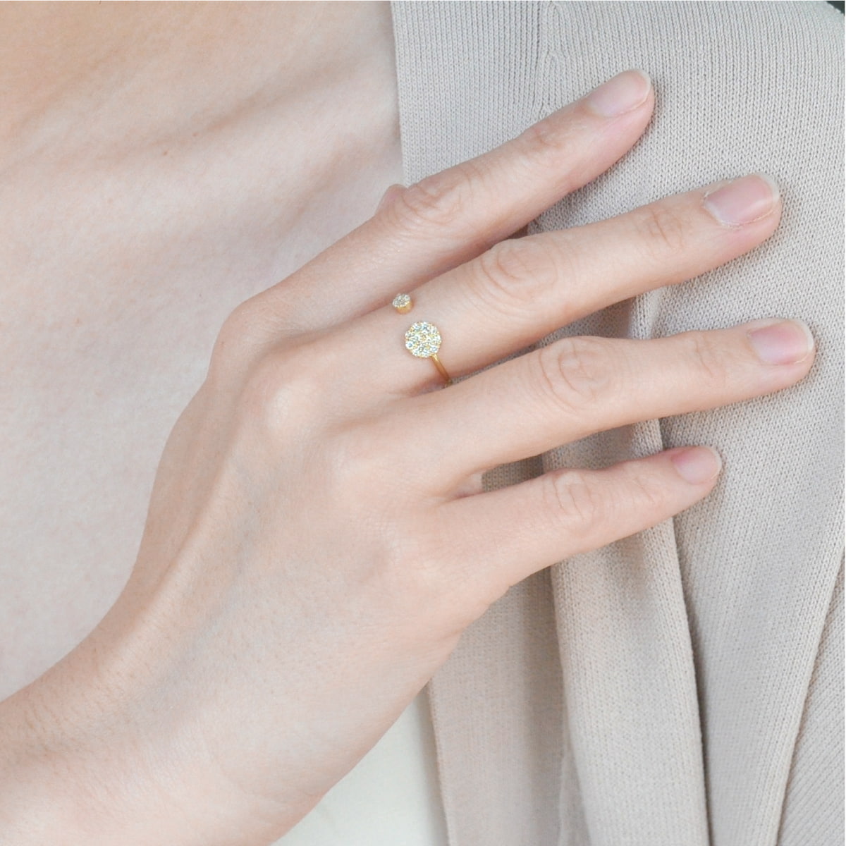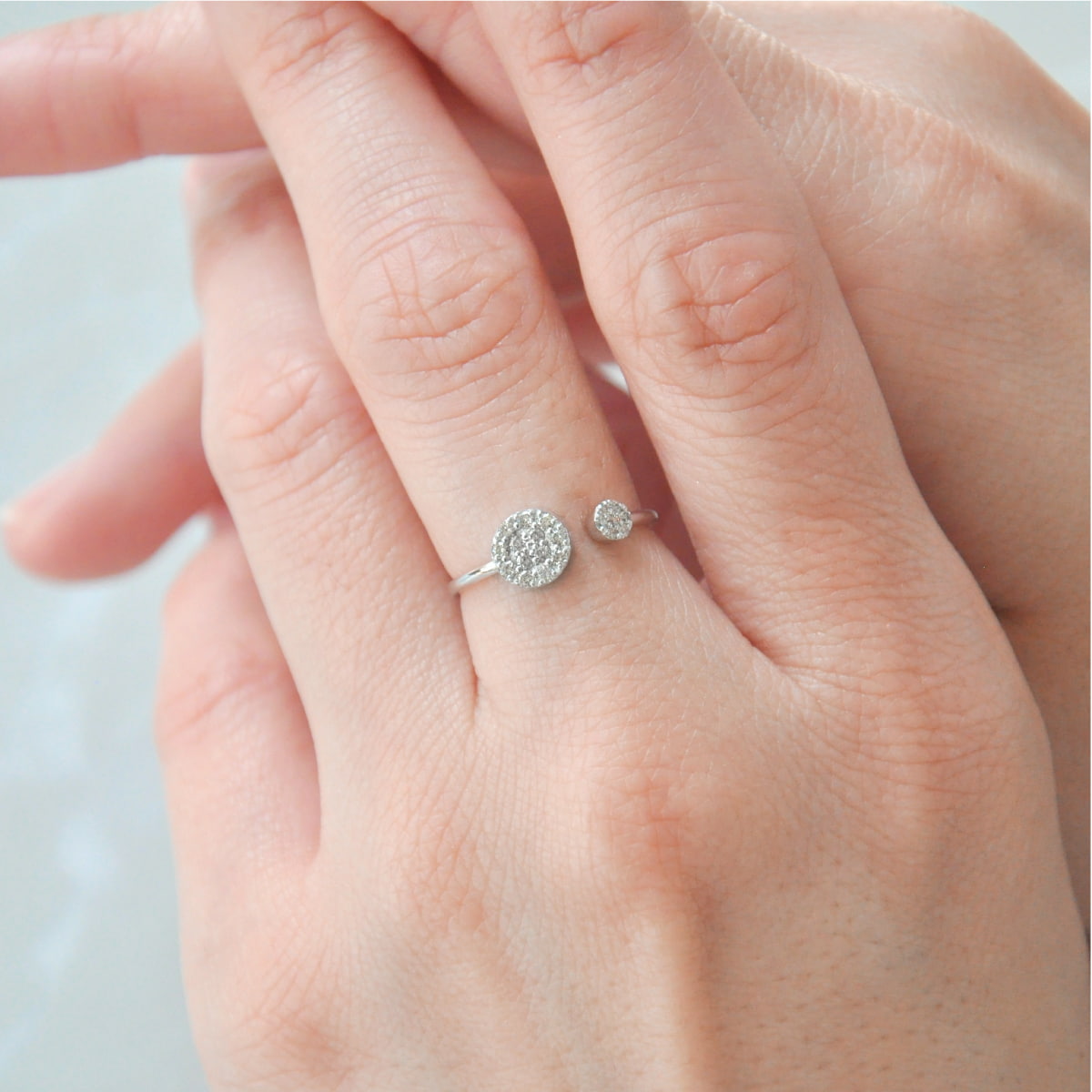 大きい丸と小さい丸が並ぶことで楽しげな印象を与えるデザイン。フォークリング特有の隙間が手元に抜け感を生み、ふたつの丸の大きさの違いやダイヤモンドの輝きを際立たせます。