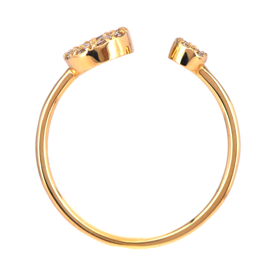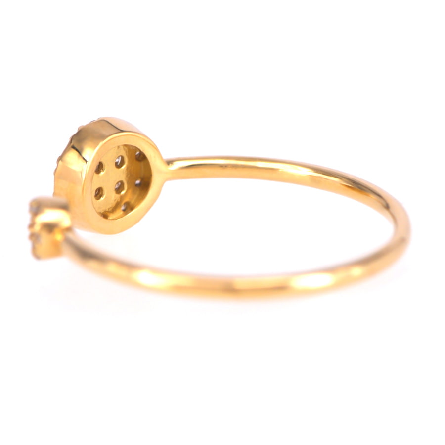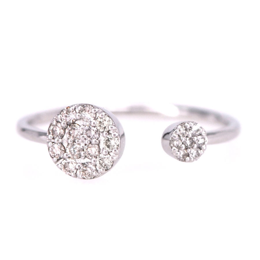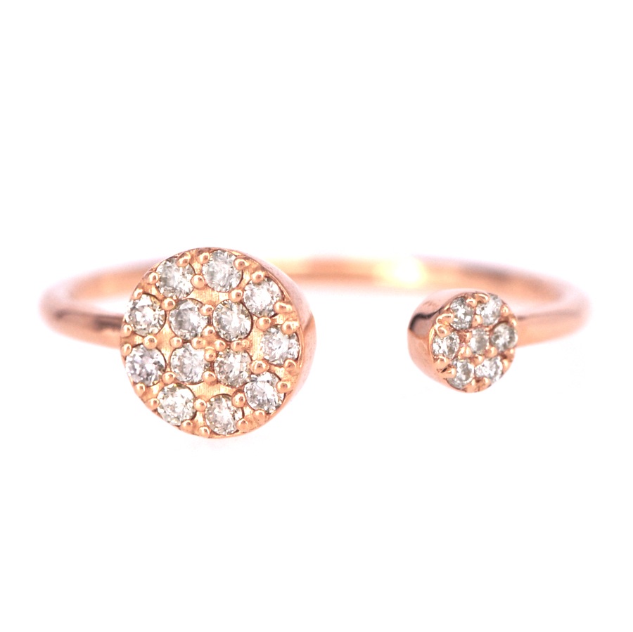 大きい丸と小さい丸が並ぶことで楽しげな印象を与えるデザイン。フォークリング特有の隙間が手元に抜け感を生み、ふたつの丸の大きさの違いやダイヤモンドの輝きを際立たせます。