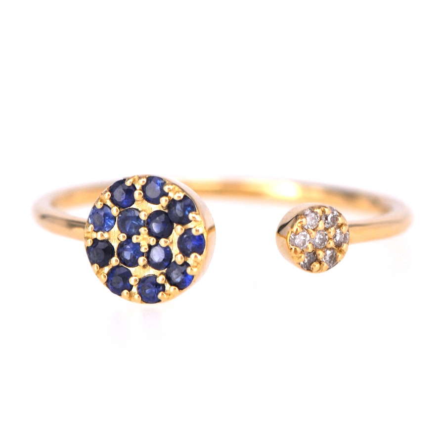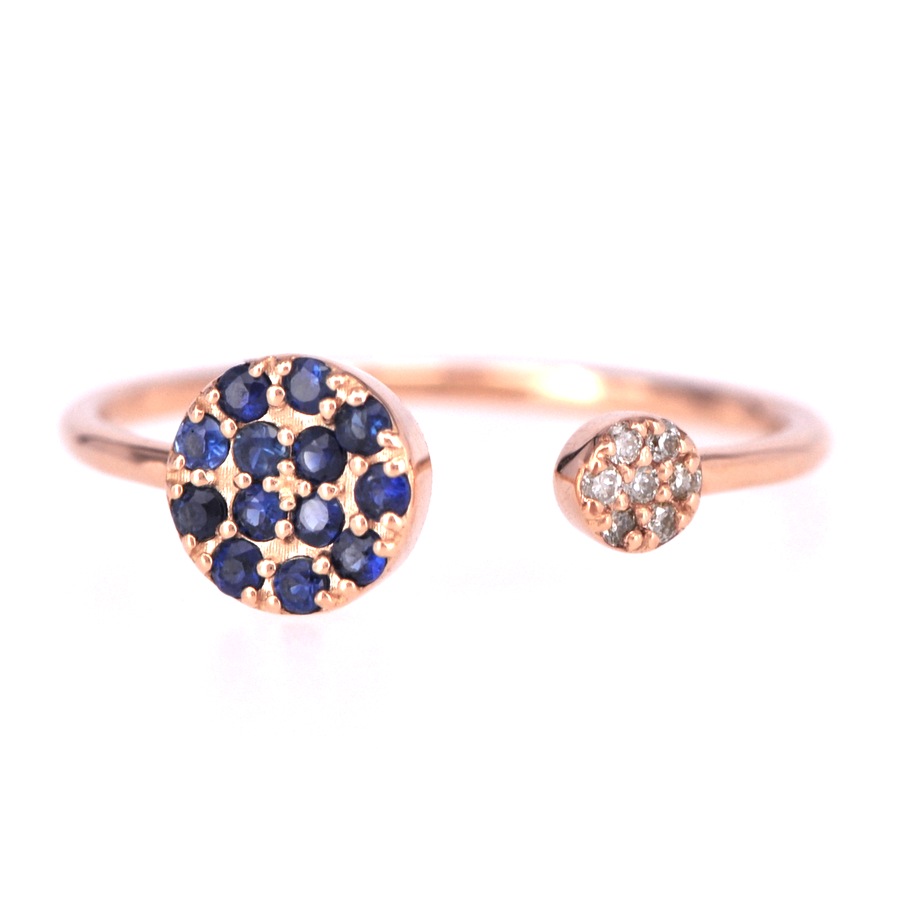 人気のフォークリングを、大きさの異なるサークルにストーンを敷き詰めたデザイン性の高いジュエリーに仕上げました。輪の一部が途切れ、隙間が空いたような形のリングで、オープンリングとも呼ばれます。