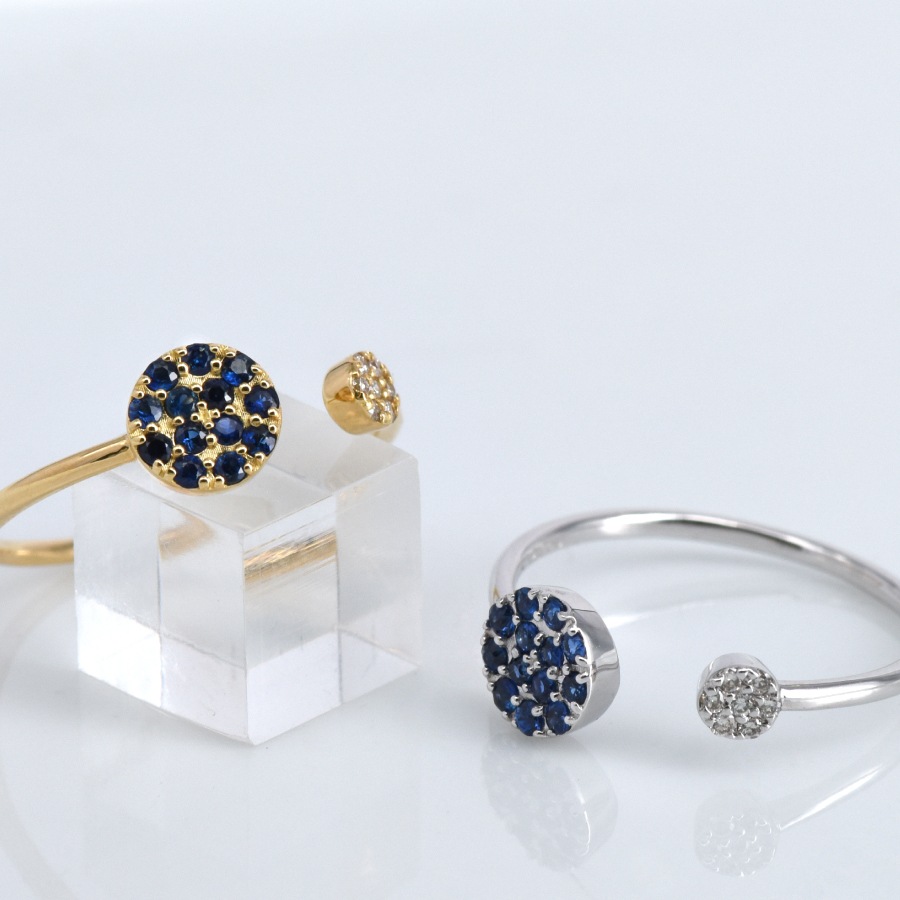 小粒のサファイアとダイヤモンドをパヴェセッティングで仕上げることで、あらゆる角度から煌めきを楽しめます。