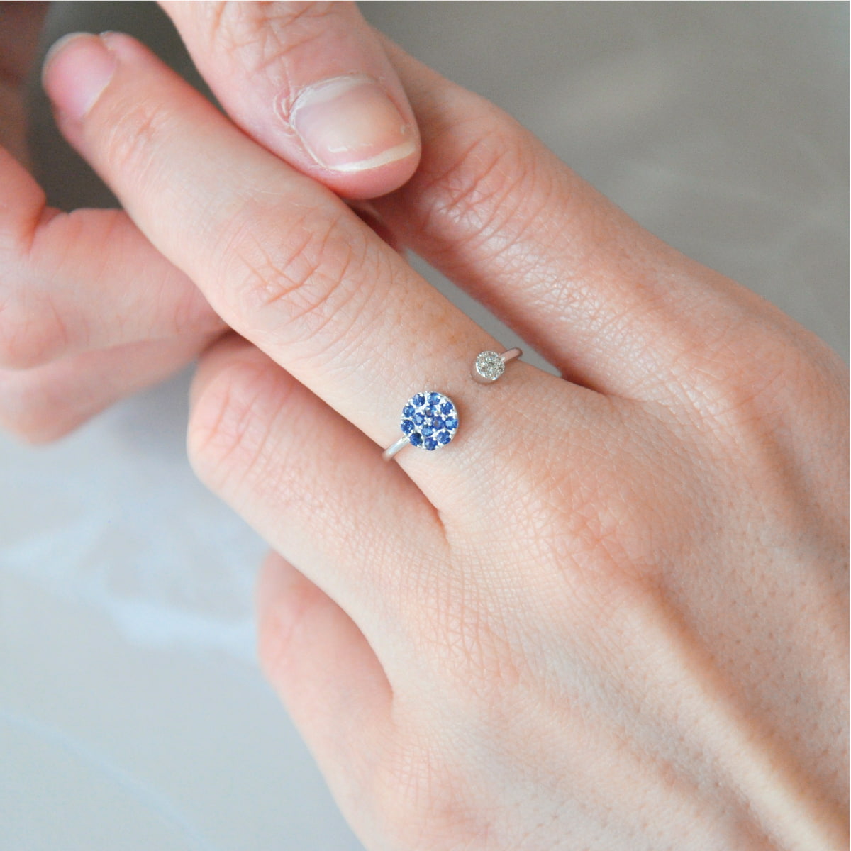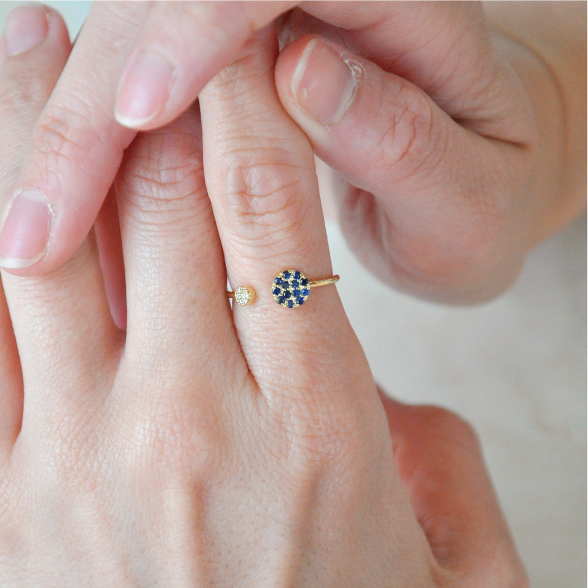 大きい丸と小さい丸が並ぶことで楽しげな印象を与えるデザイン。フォークリング特有の隙間が手元に抜け感を生み、ふたつの丸の大きさの違いや天然石の輝きを際立たせます。