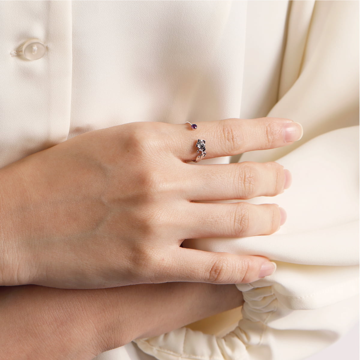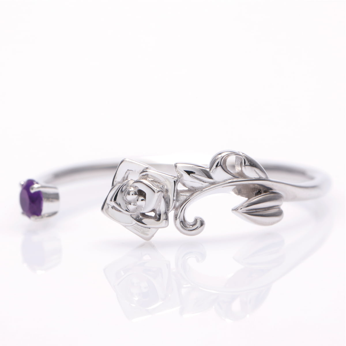 上品なアメシストのカラーは女性らしいローズモチーフと相性抜群。大人らしい落ち着きのある雰囲気を演出します。