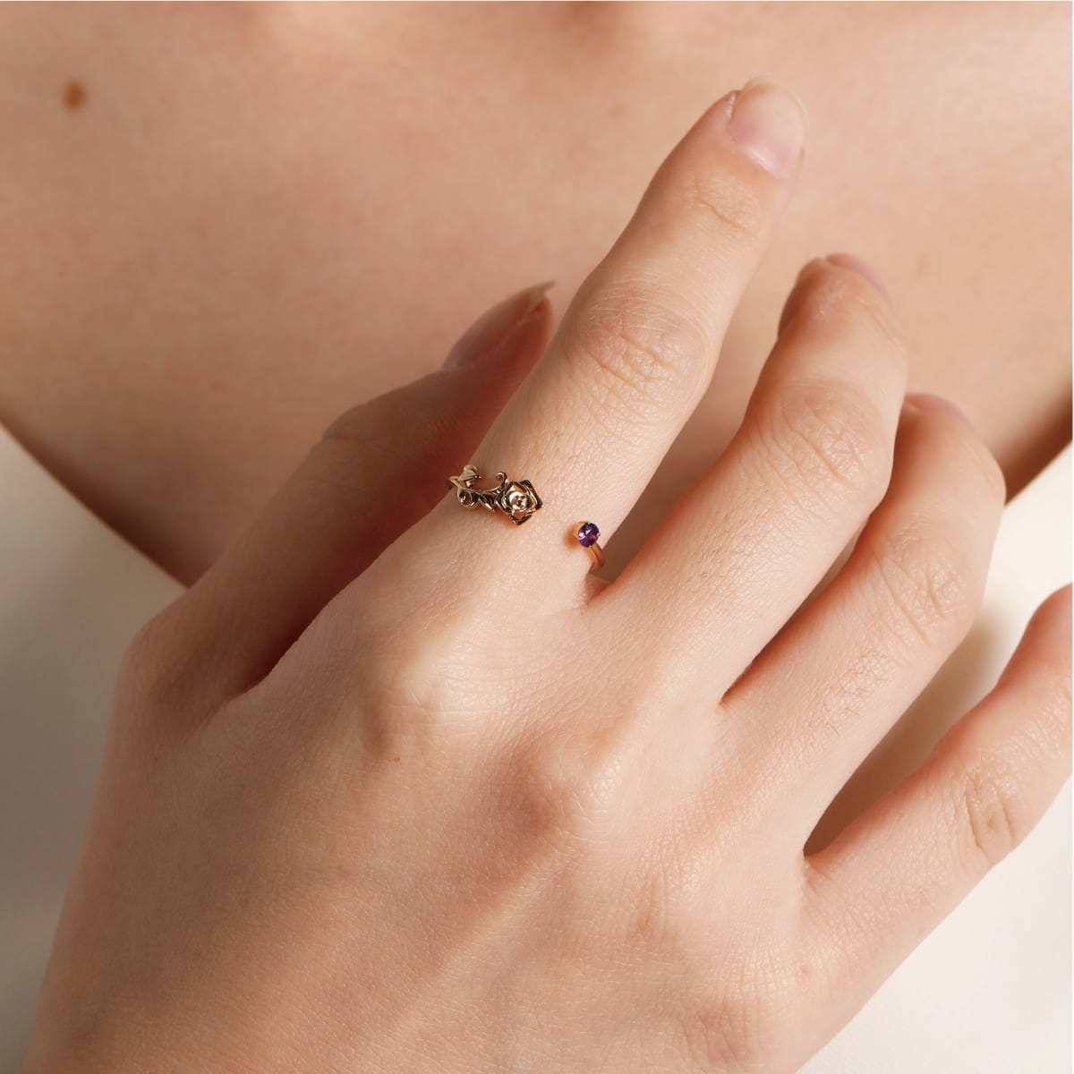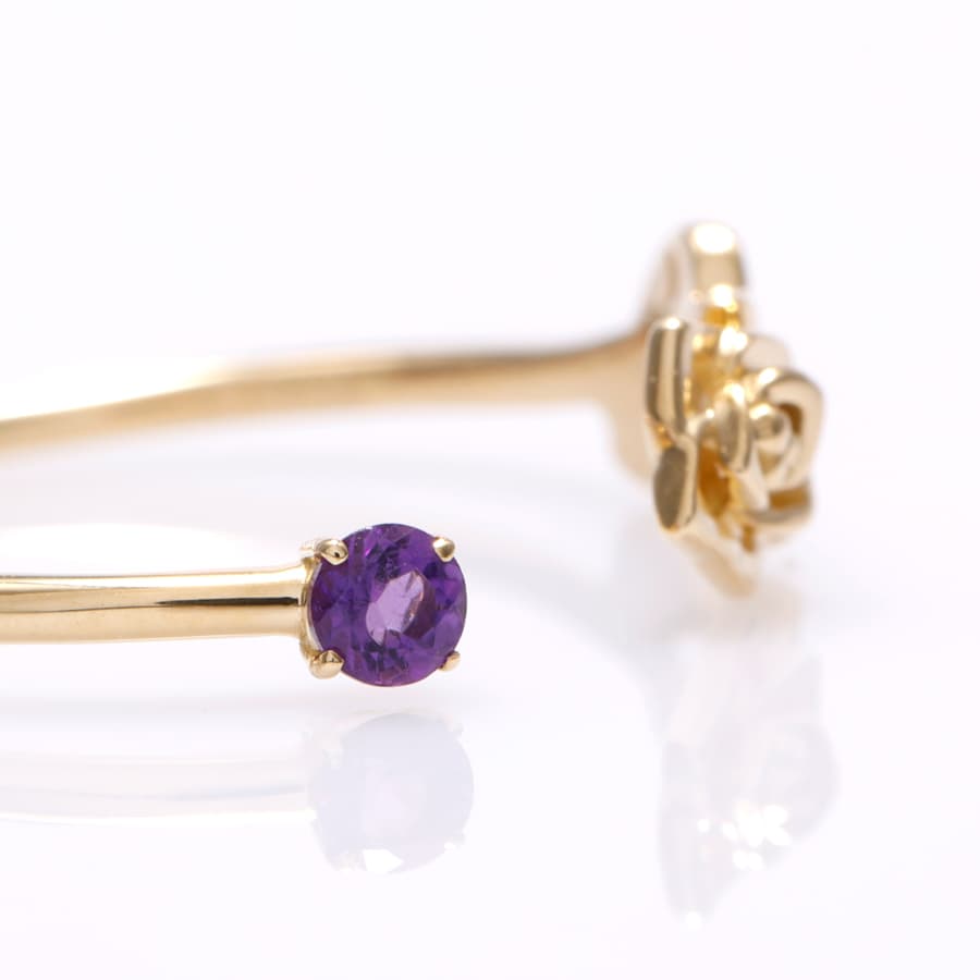 より華やかで、より繊細になるように、微調整を重ねたこだわりのディテール。アメシストは4本の爪で留めることですっきりと見え、片側のバラは、アンティーク調のレリーフのような立体感。