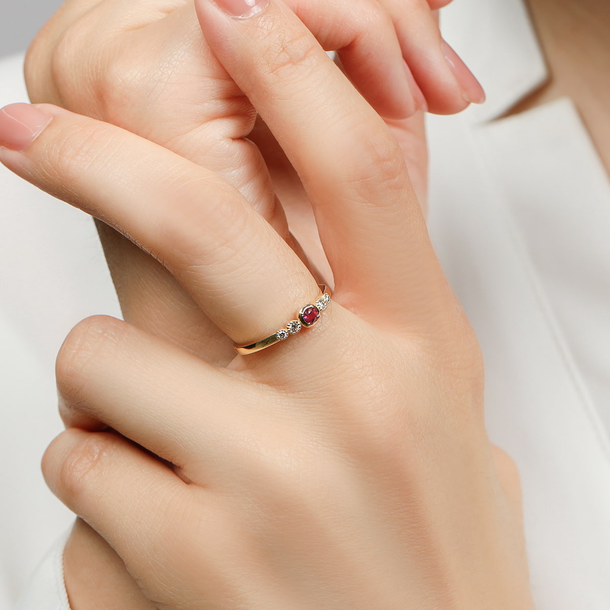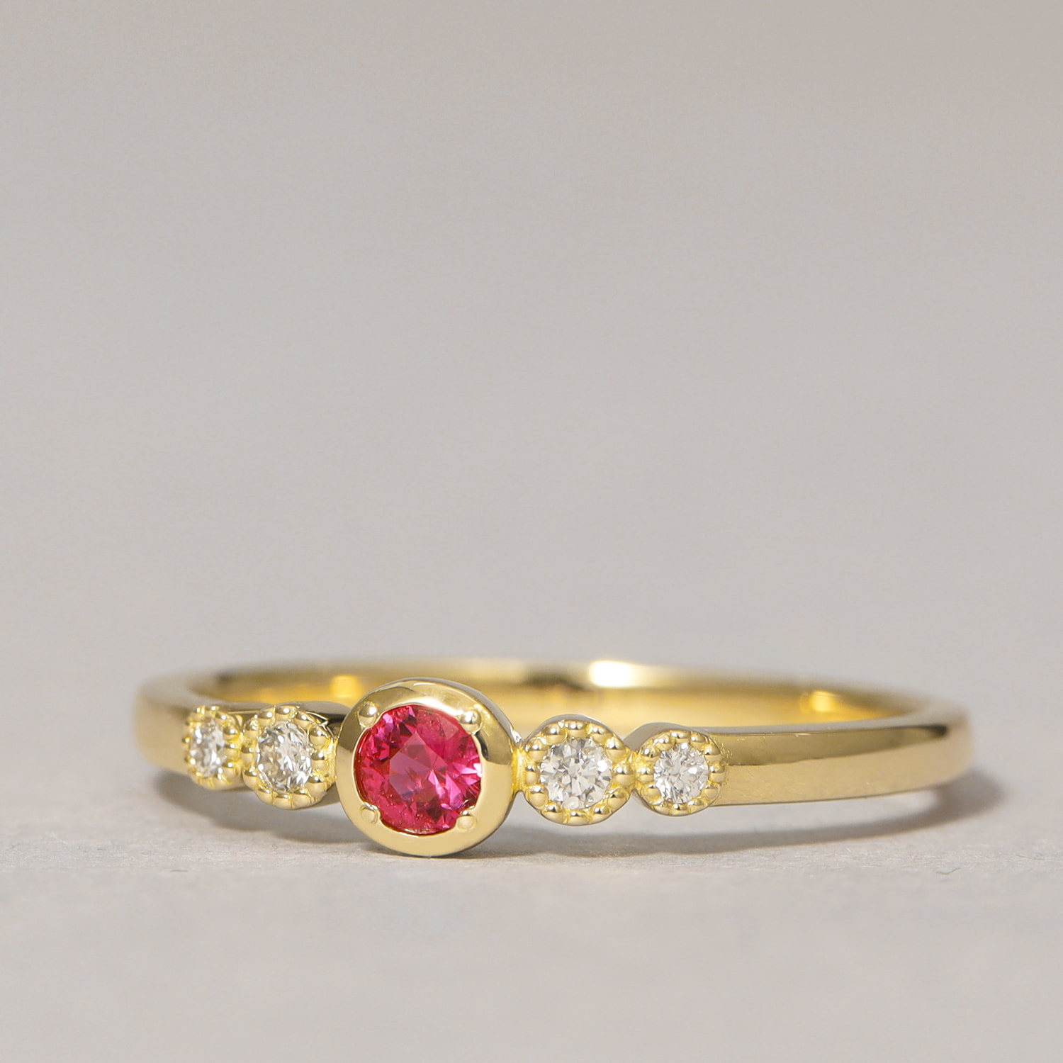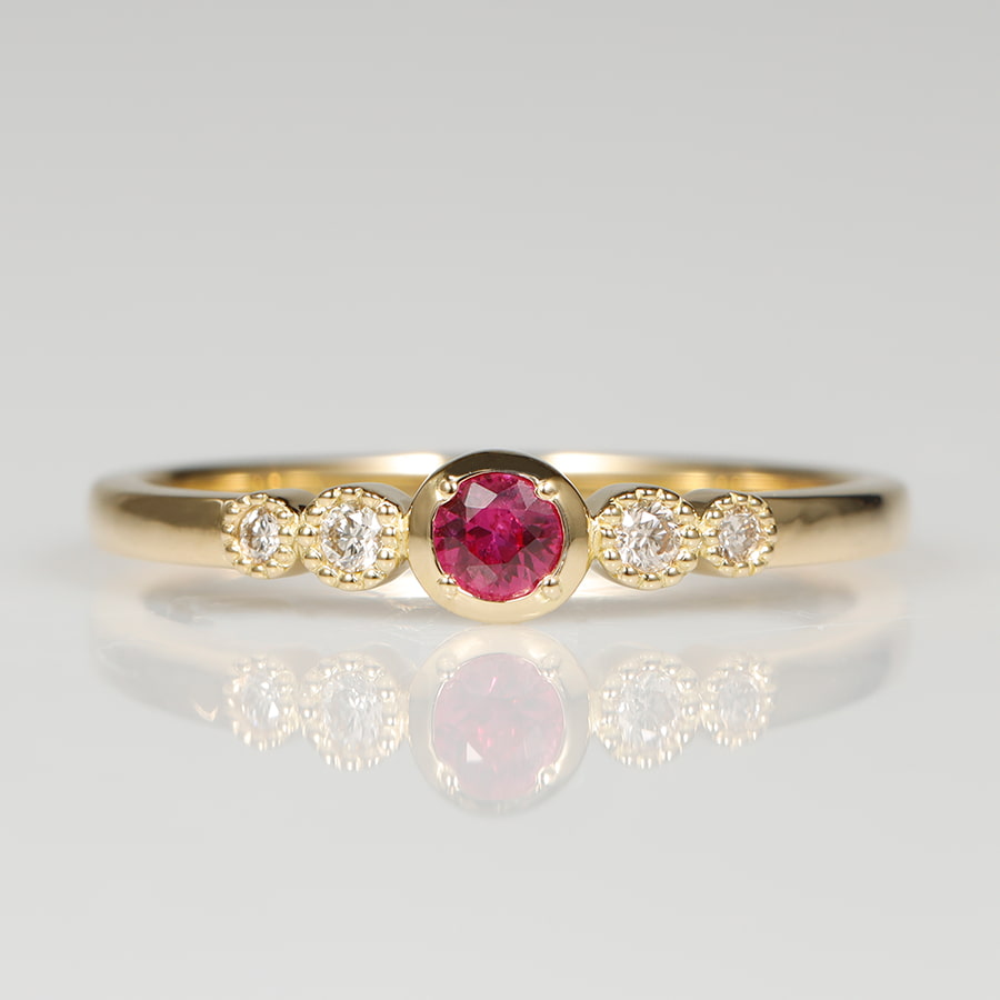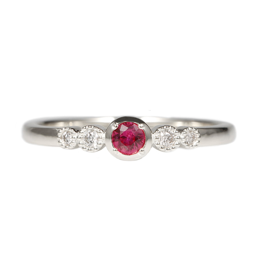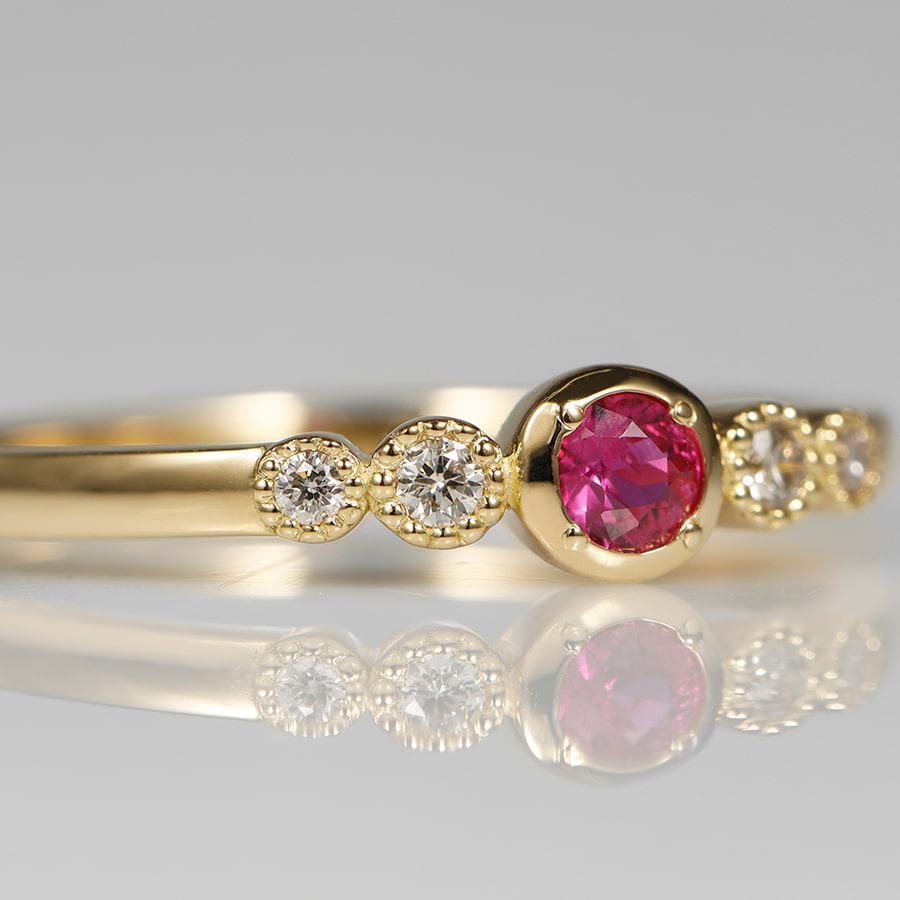 脇の4石のダイヤモンドを小さな粒で囲むことで、よりキラキラとした印象に。メインのルビーも輝きを隠さないように極力小さな爪で留めています。毎日のマストアイテムにリングアームはしっかりとしていて裏抜きもないので、なめらかな着け心地です。