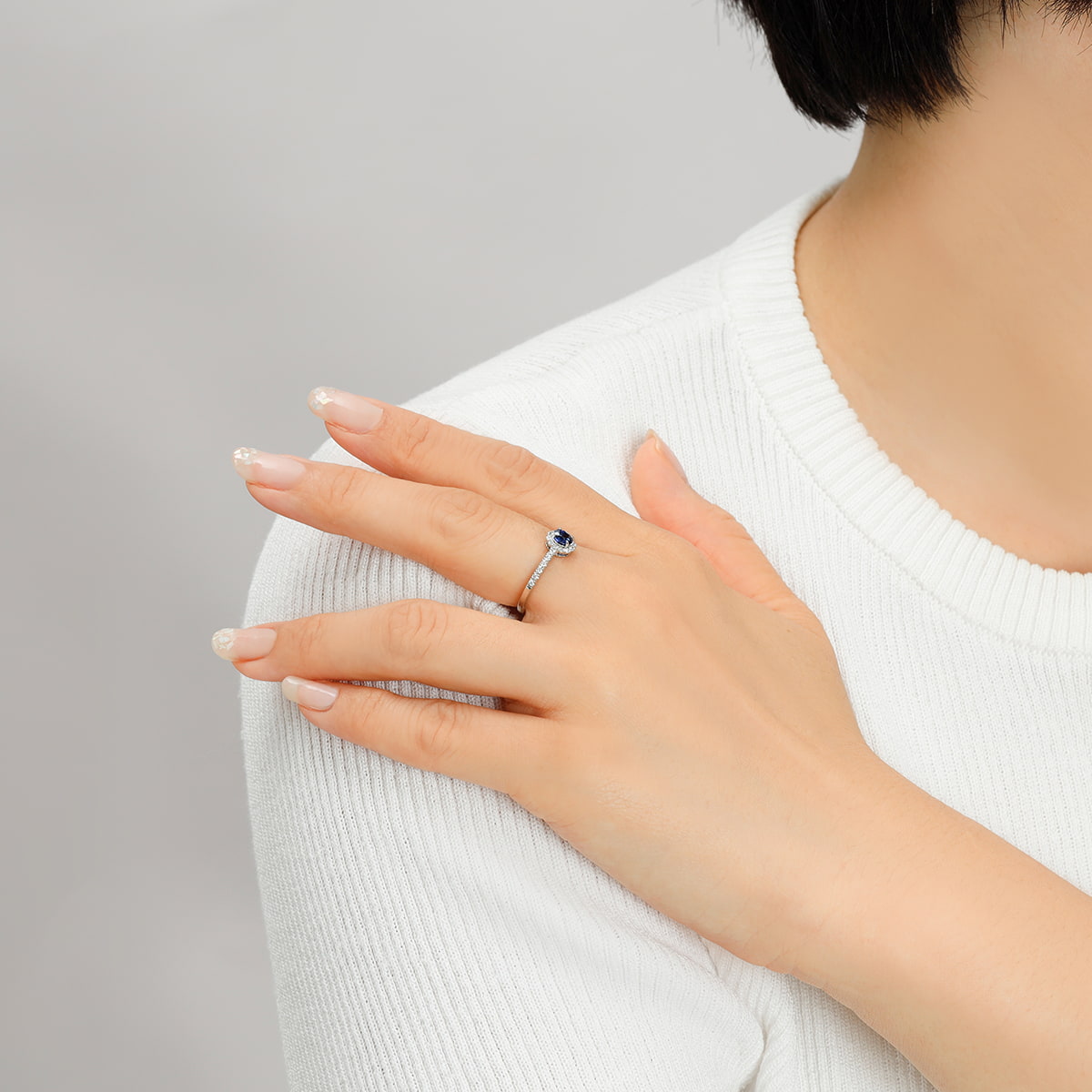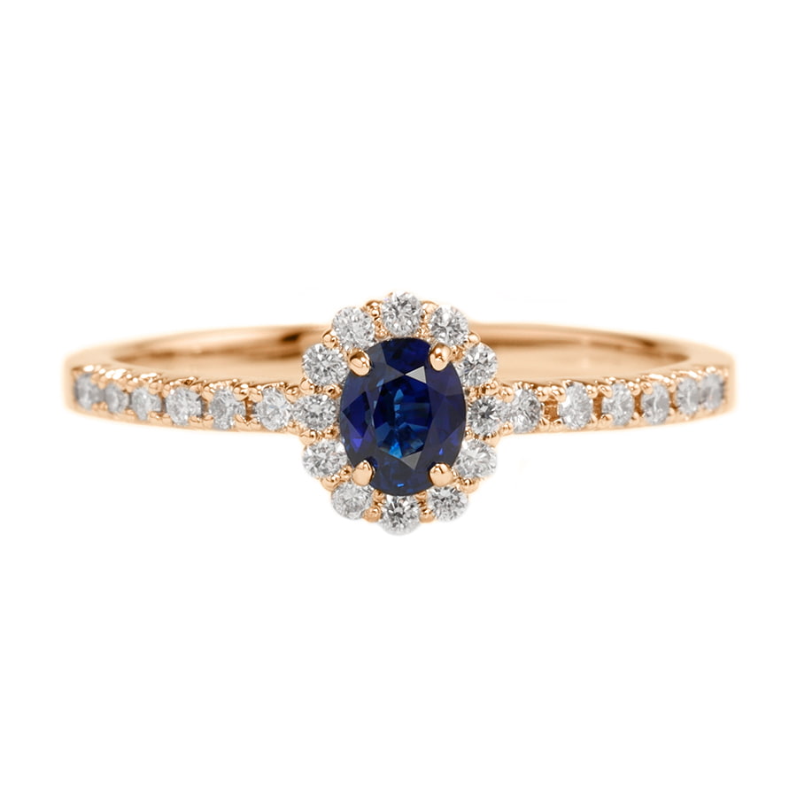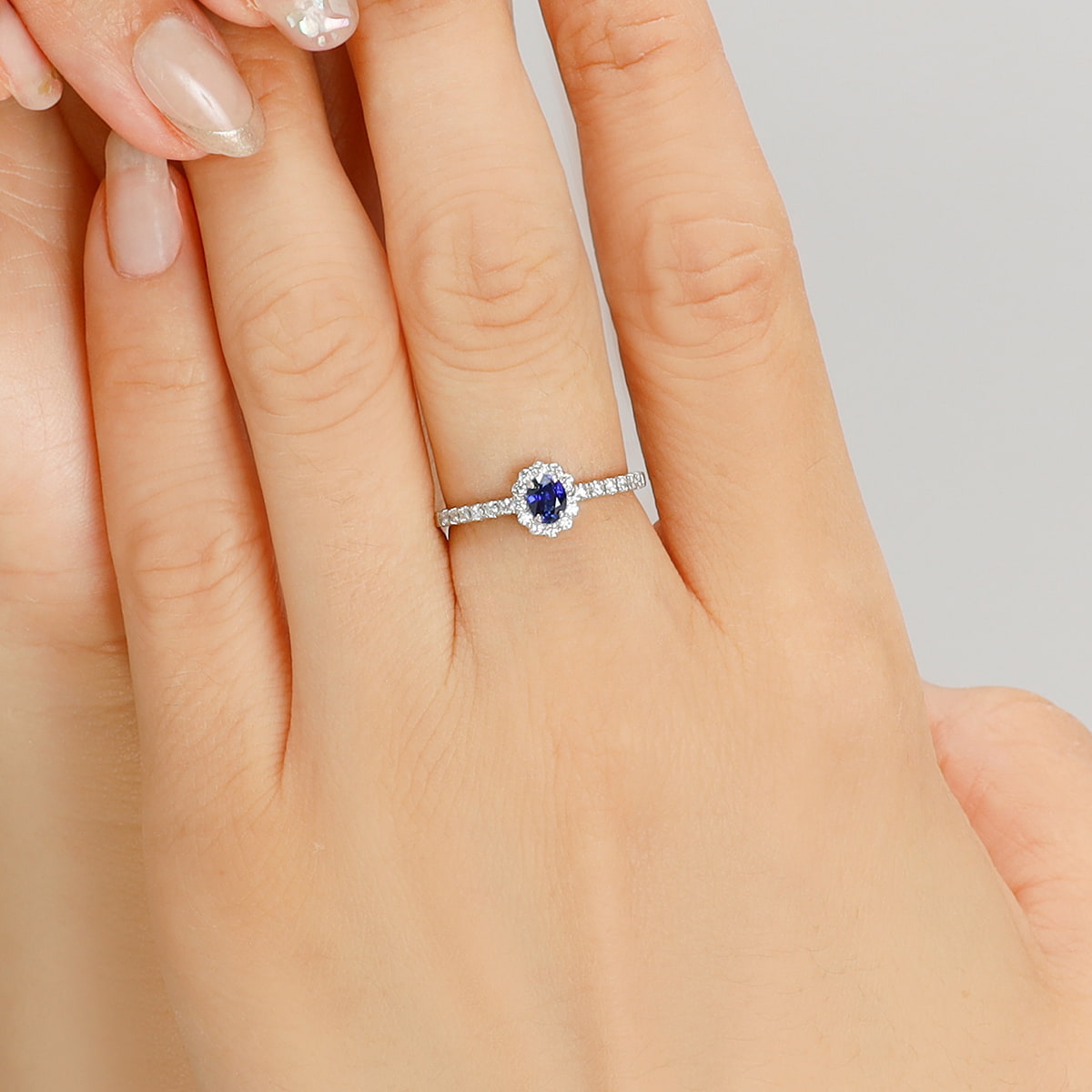 ヘイローデザインは、日常使いにも適するようにダイヤモンドのサイズ感を調整し、美しく上品に仕上げました。ロイヤルブルーサファイアの深みのある滑らかな濃い青色とも相まって、大人の品格を漂わせます。