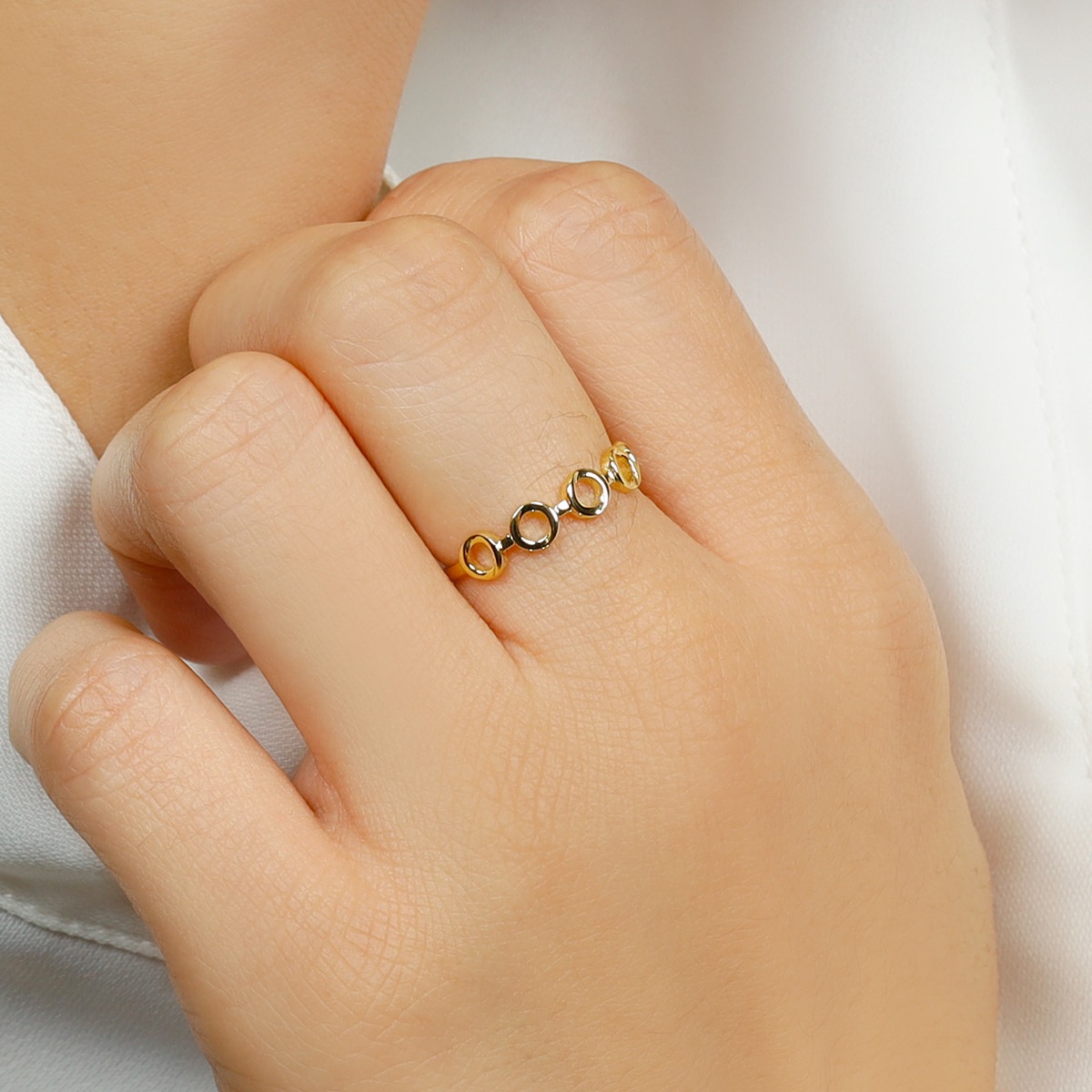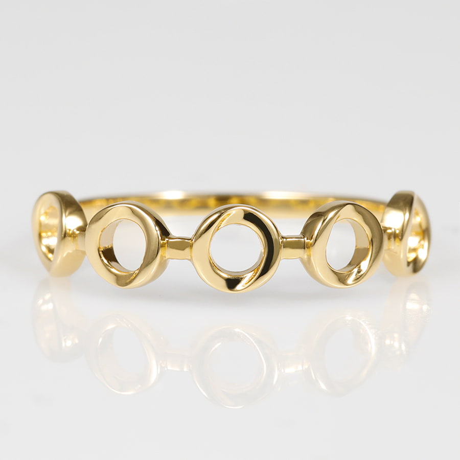 サークルモチーフを5つ並べたチェーン風のデザインリング。