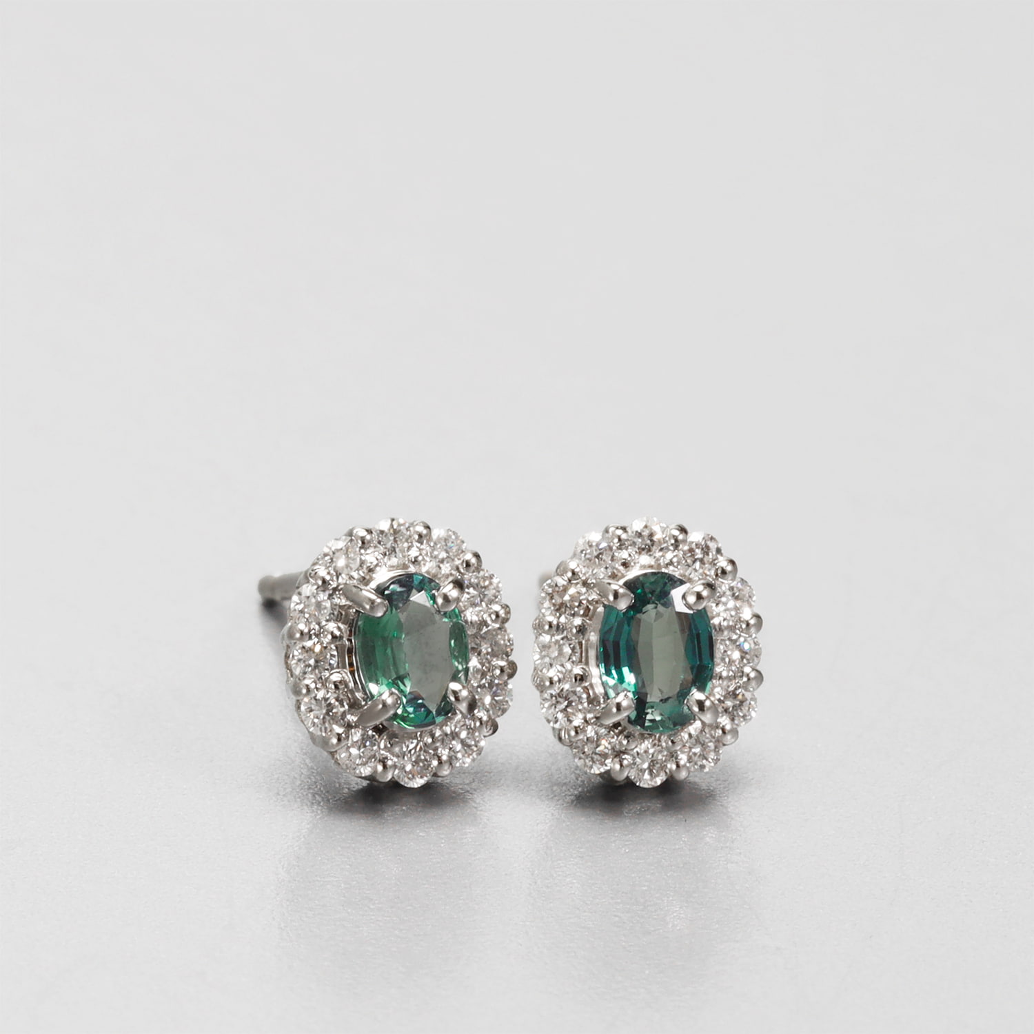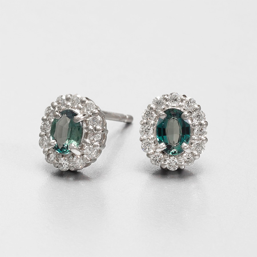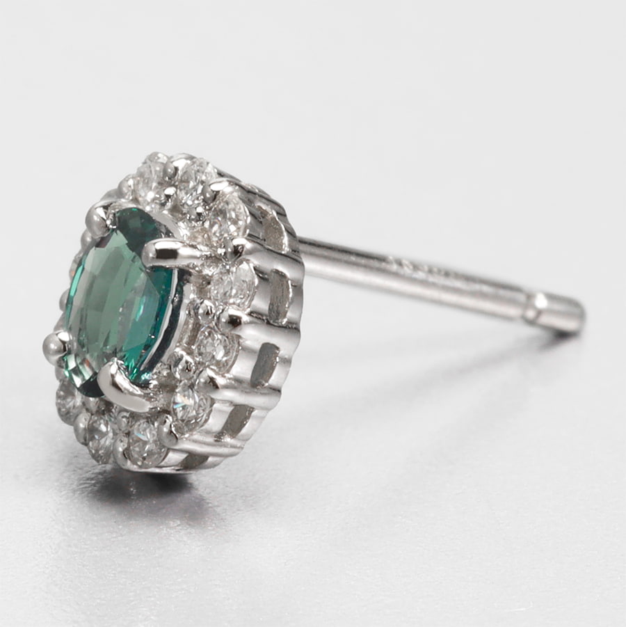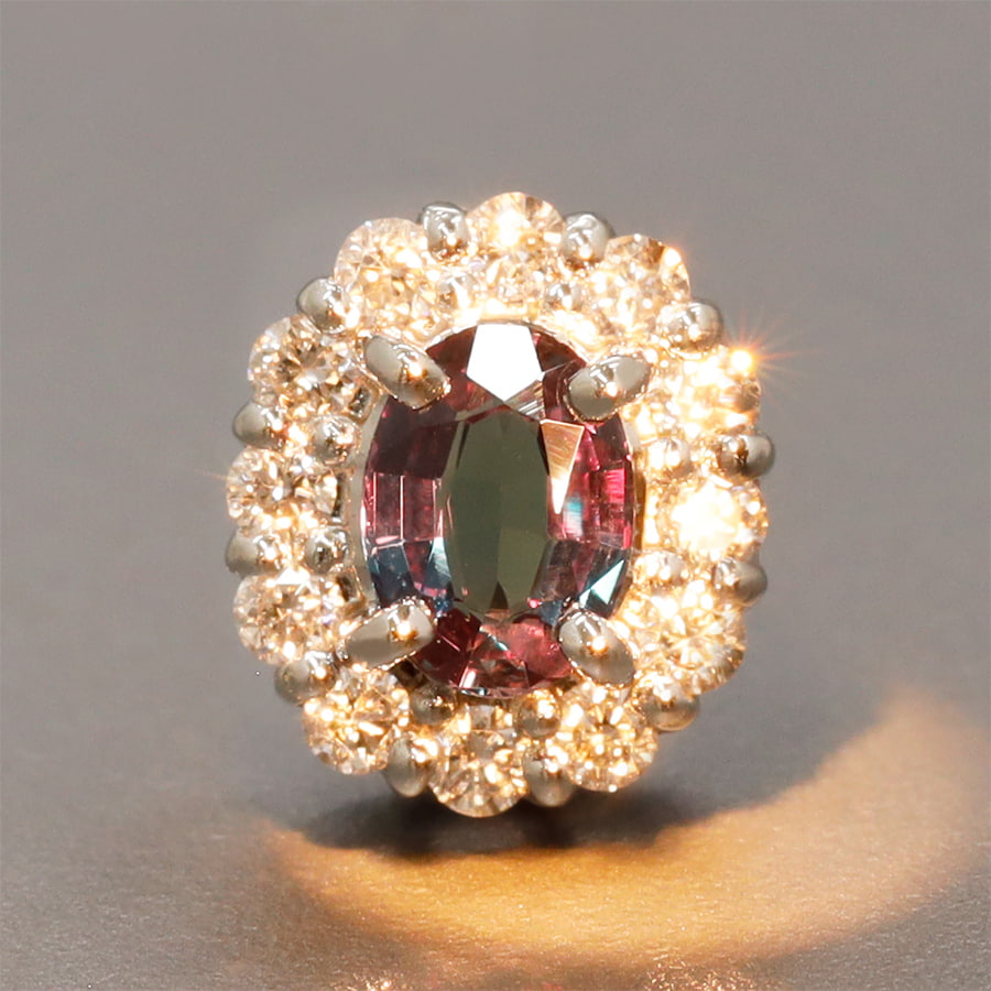 主役のアレキサンドライトを引き立たせるダイヤモンドのヘイローピアス。