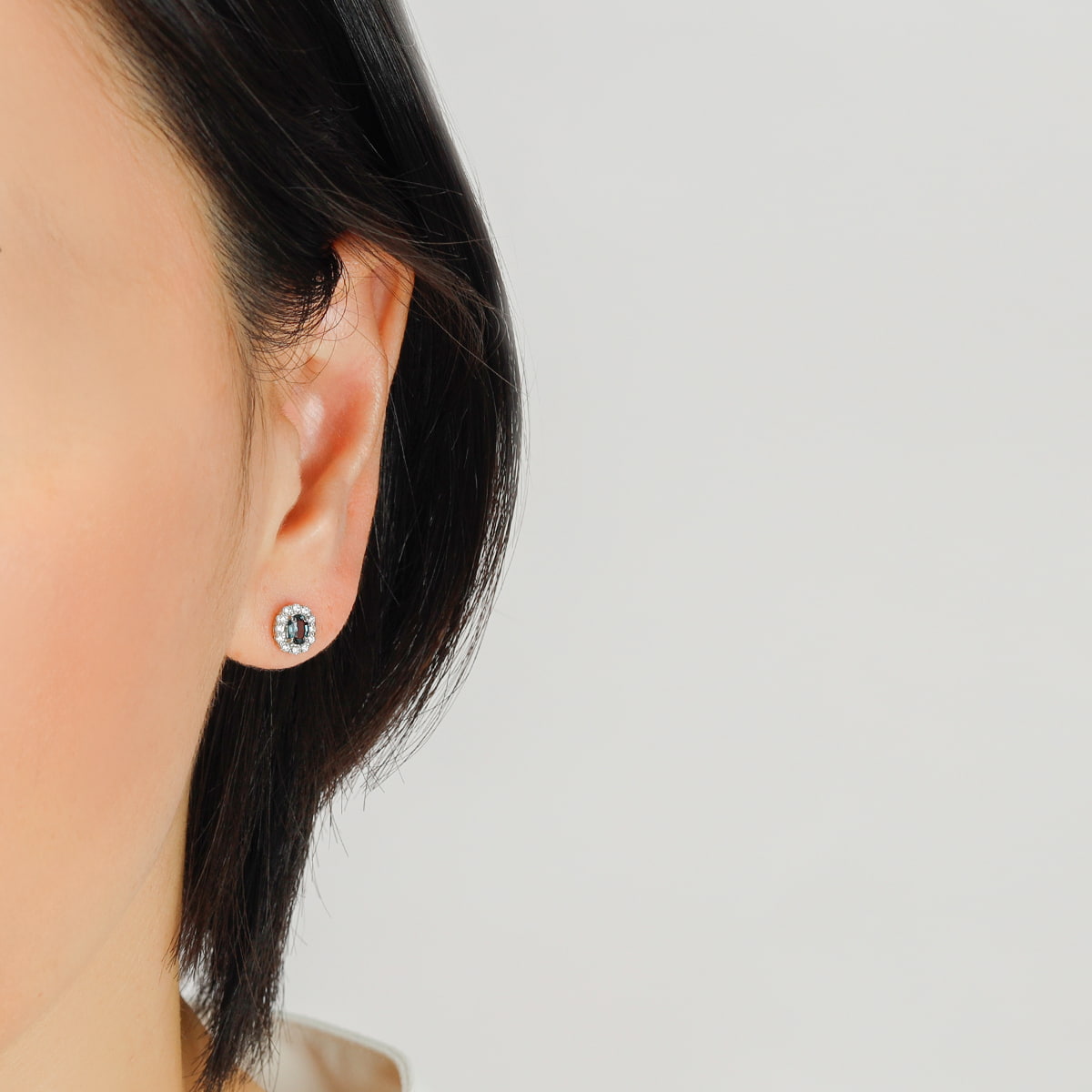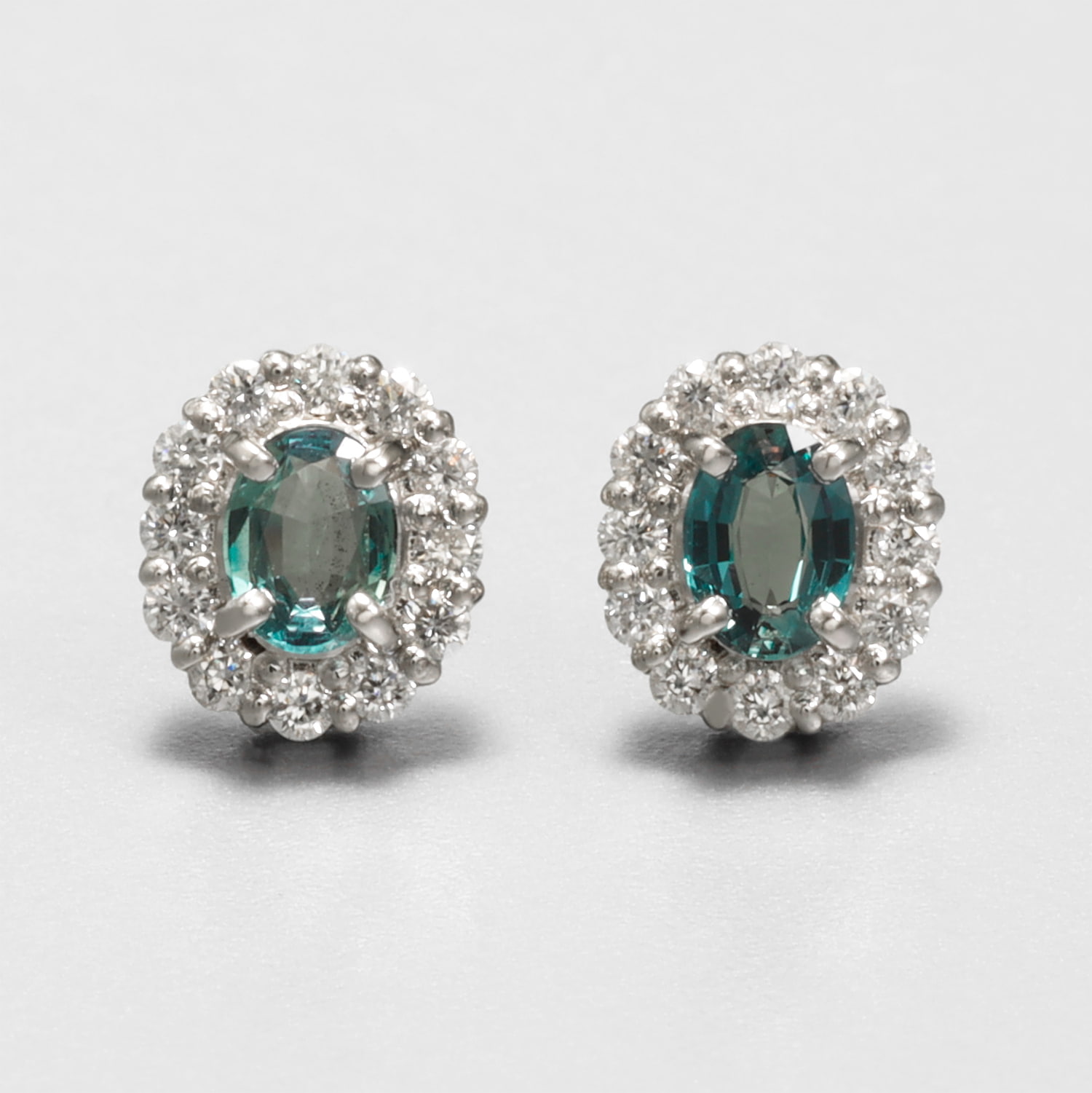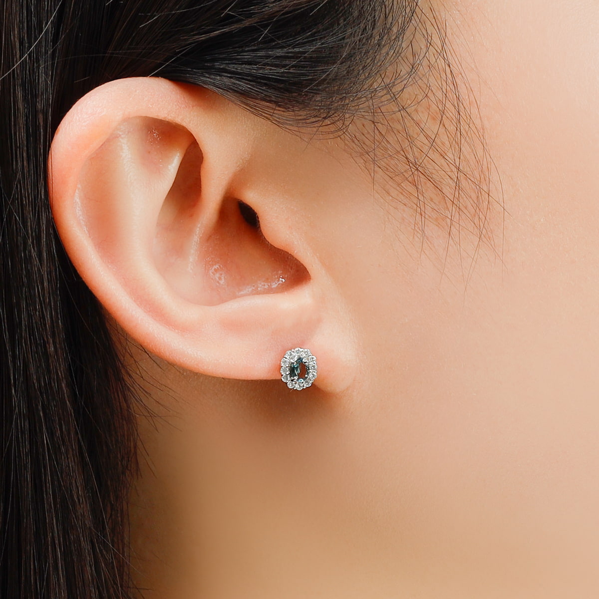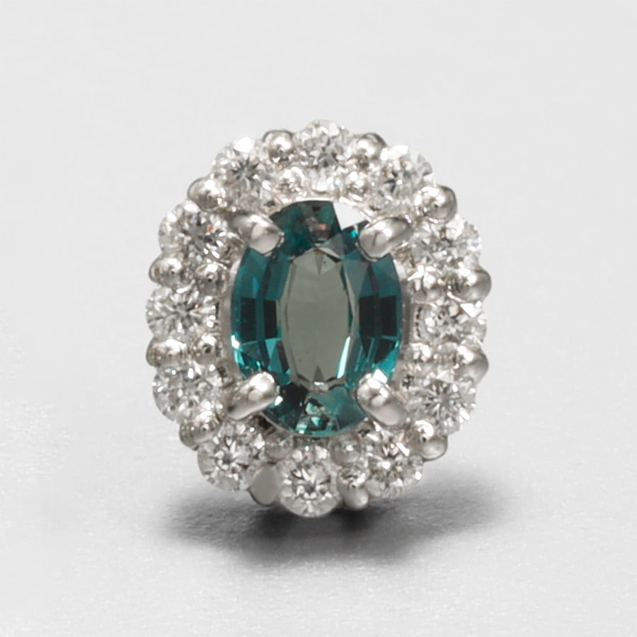 主役のアレキサンドライトを引き立たせるダイヤモンドのヘイローピアス。