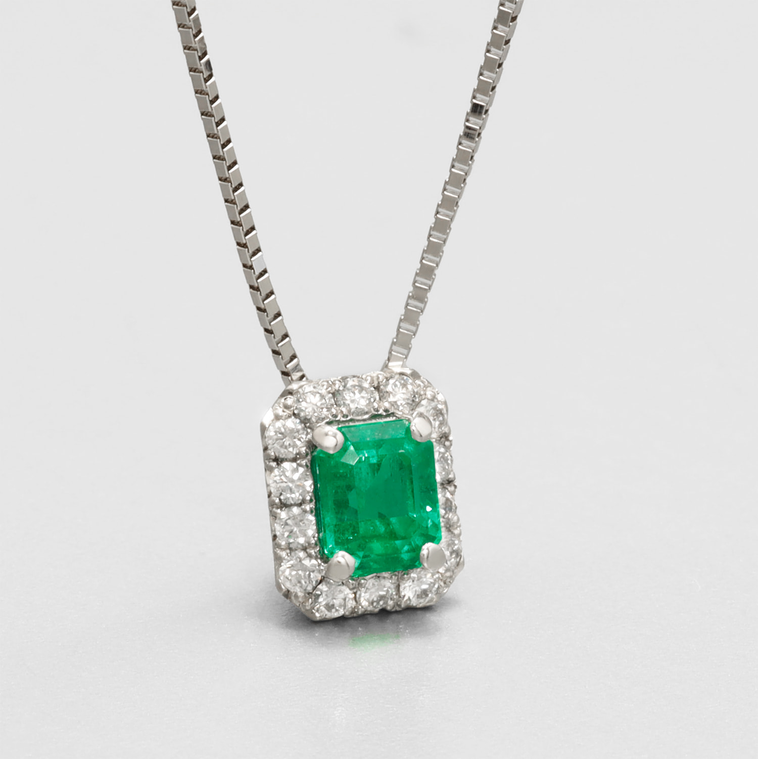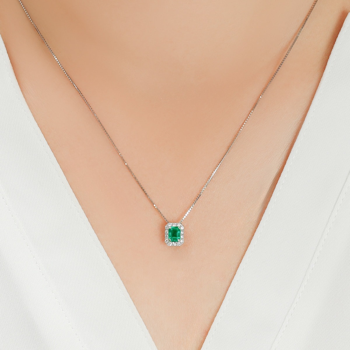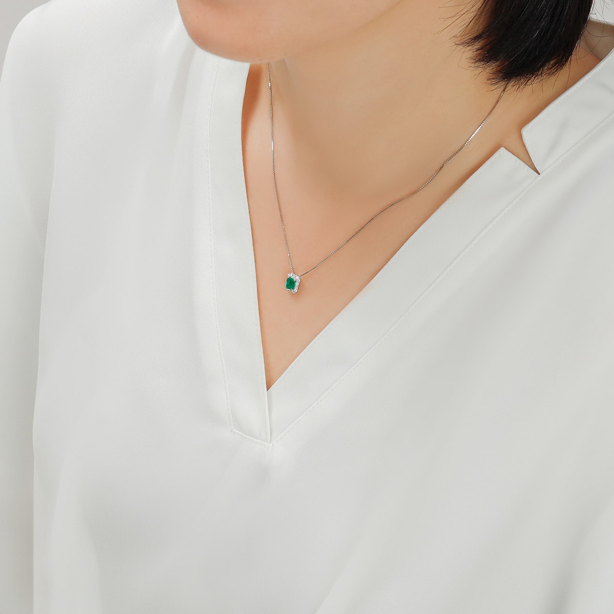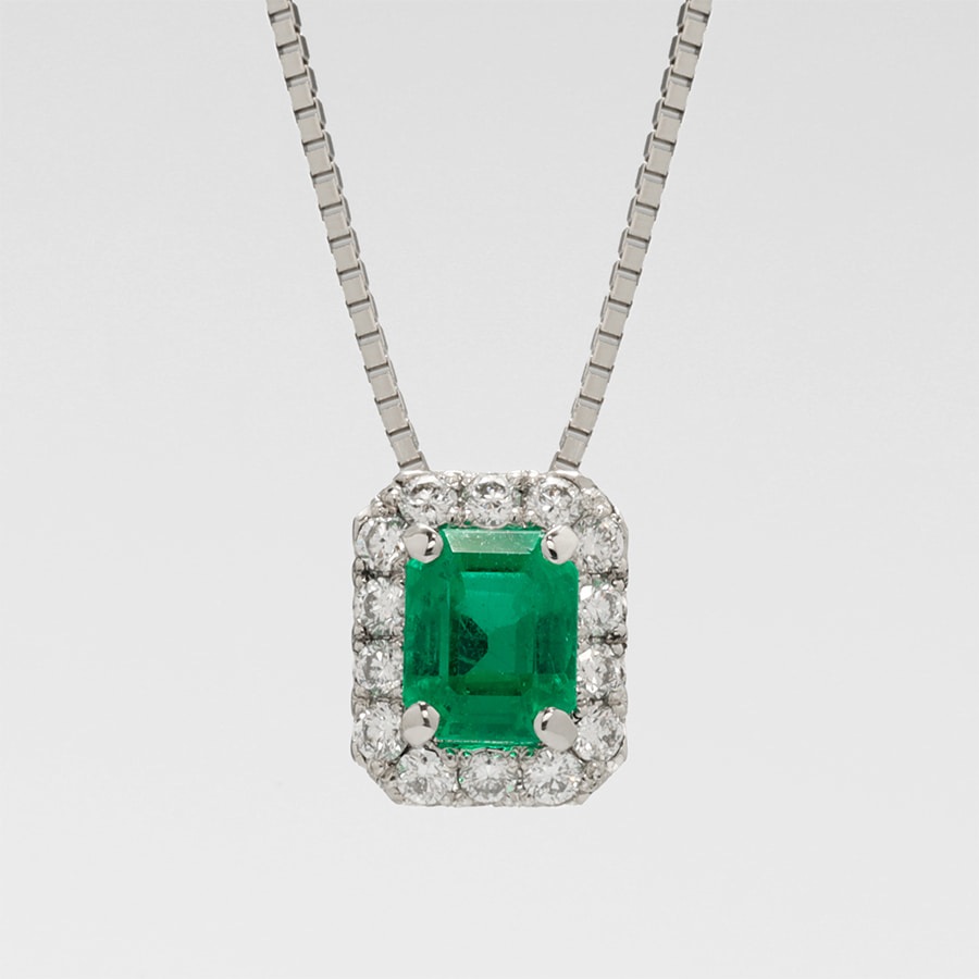 希少なエメラルドカット、0.46カラットのヘイローエメラルドネックレス。