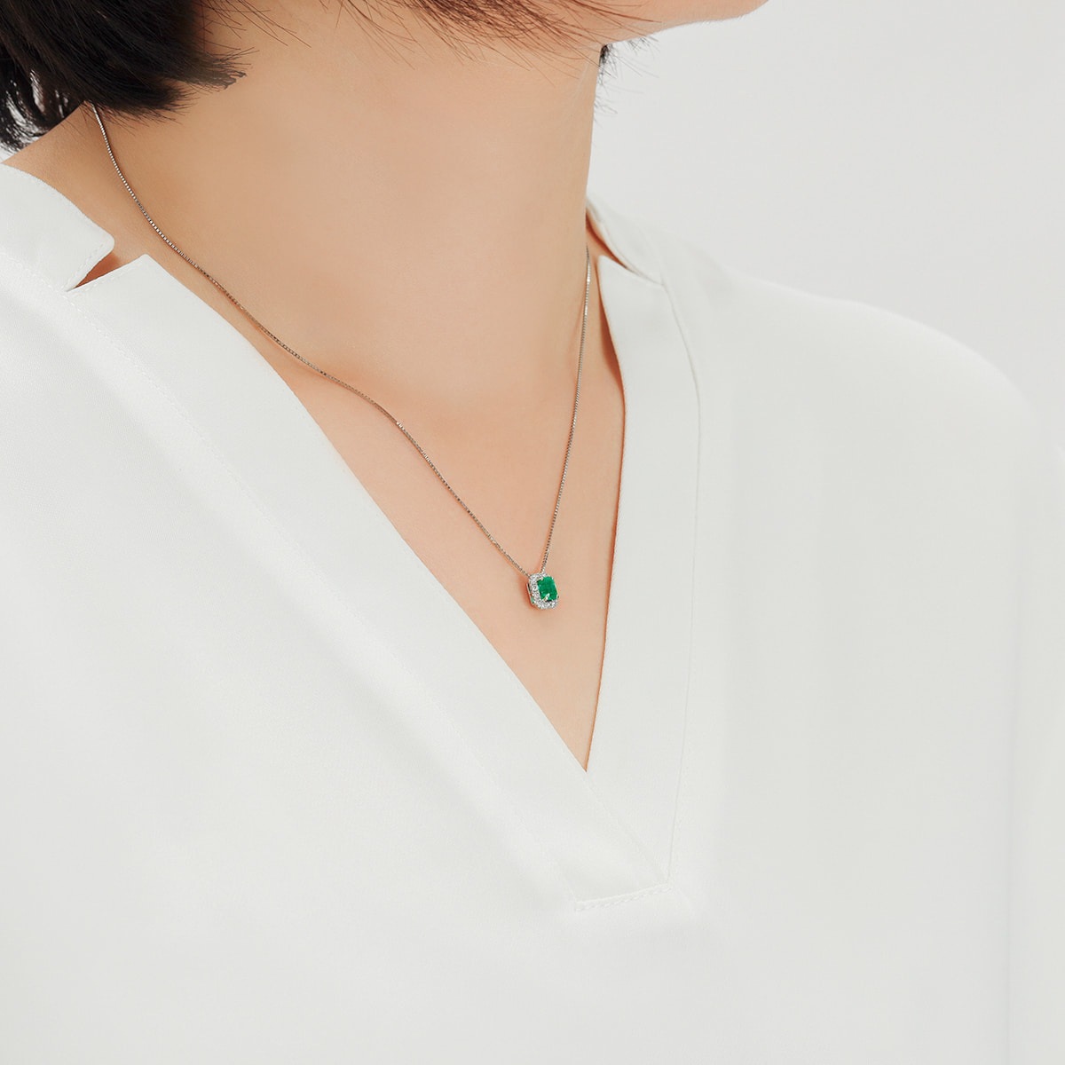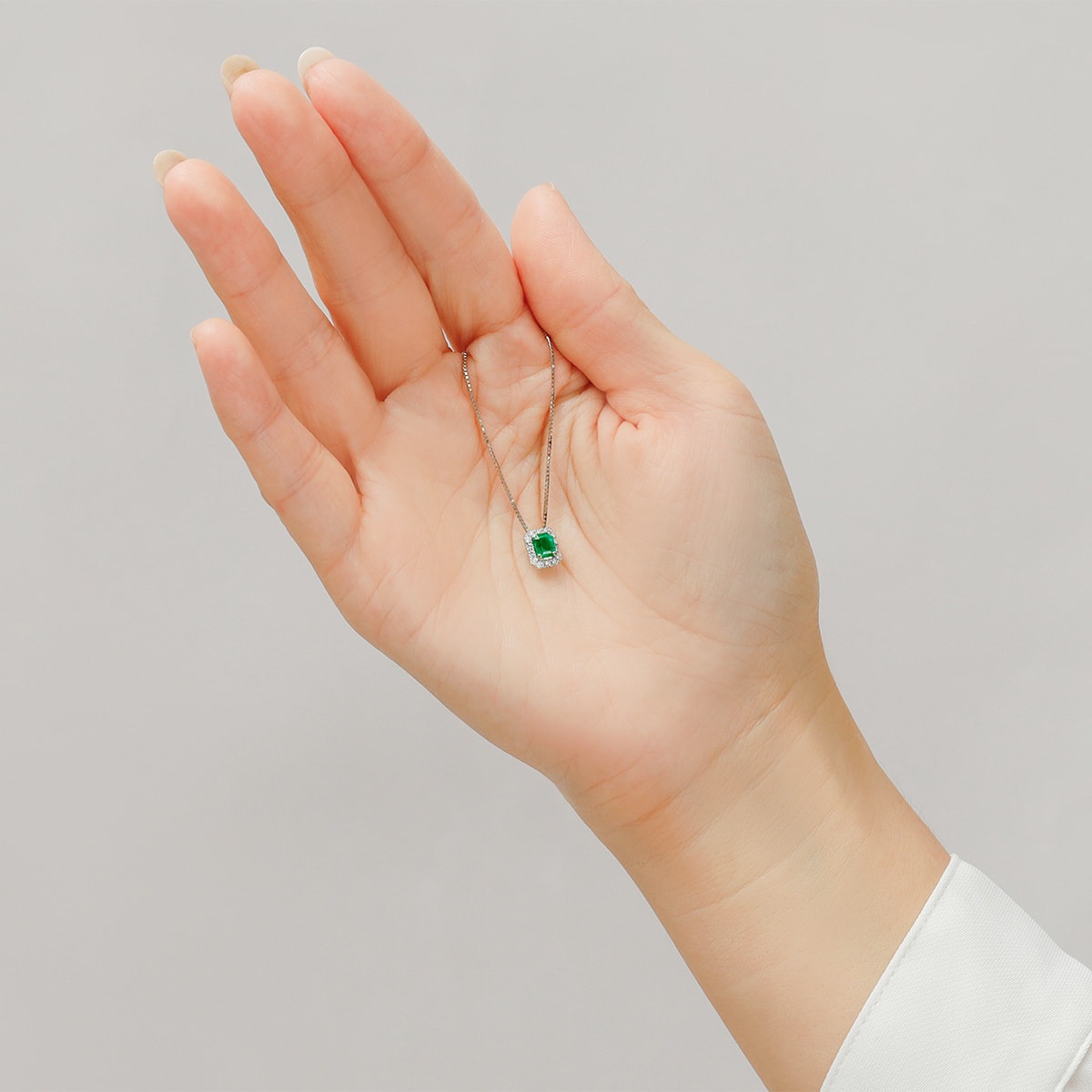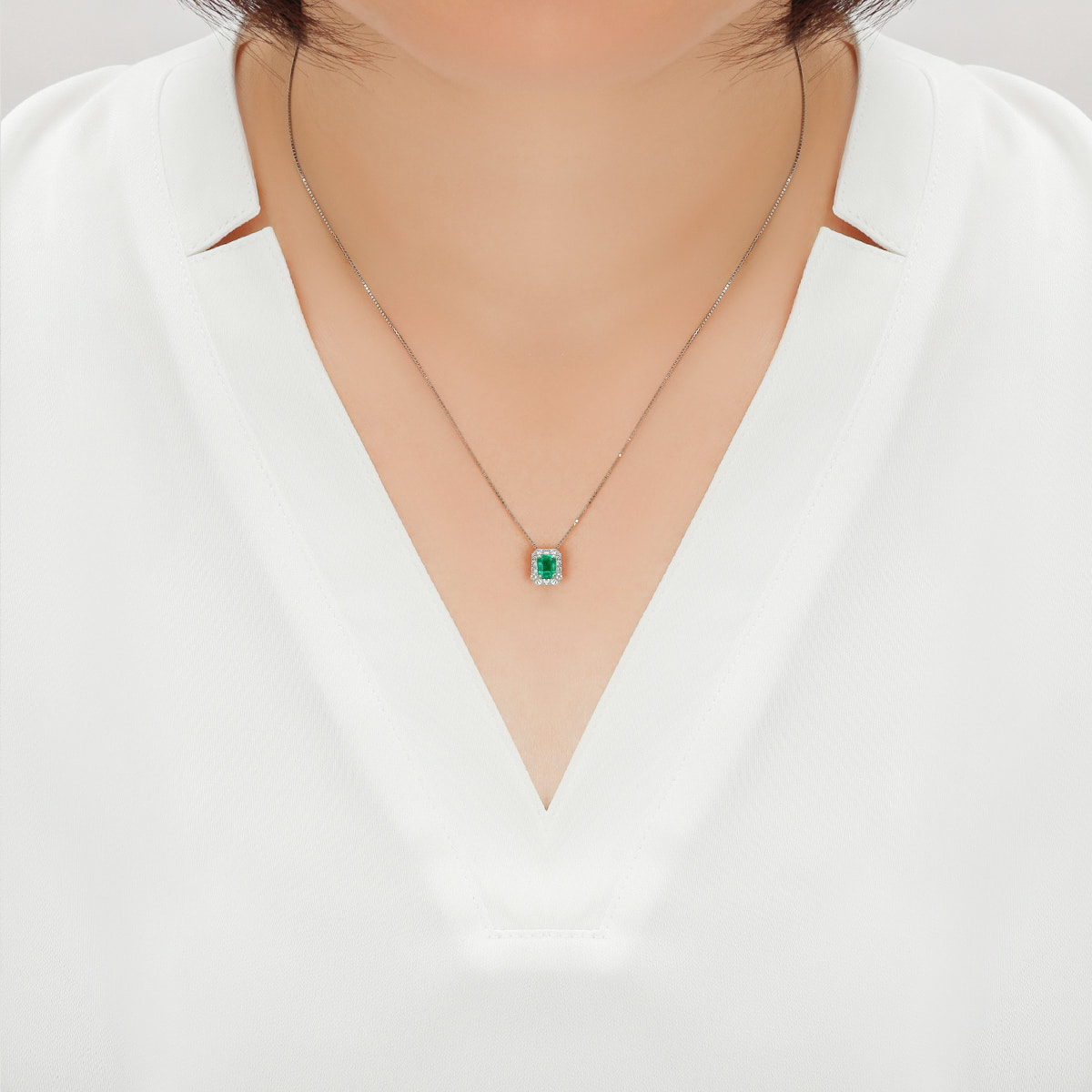 希少なエメラルドカット、0.46カラットのヘイローエメラルドネックレス。