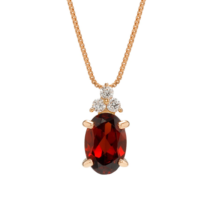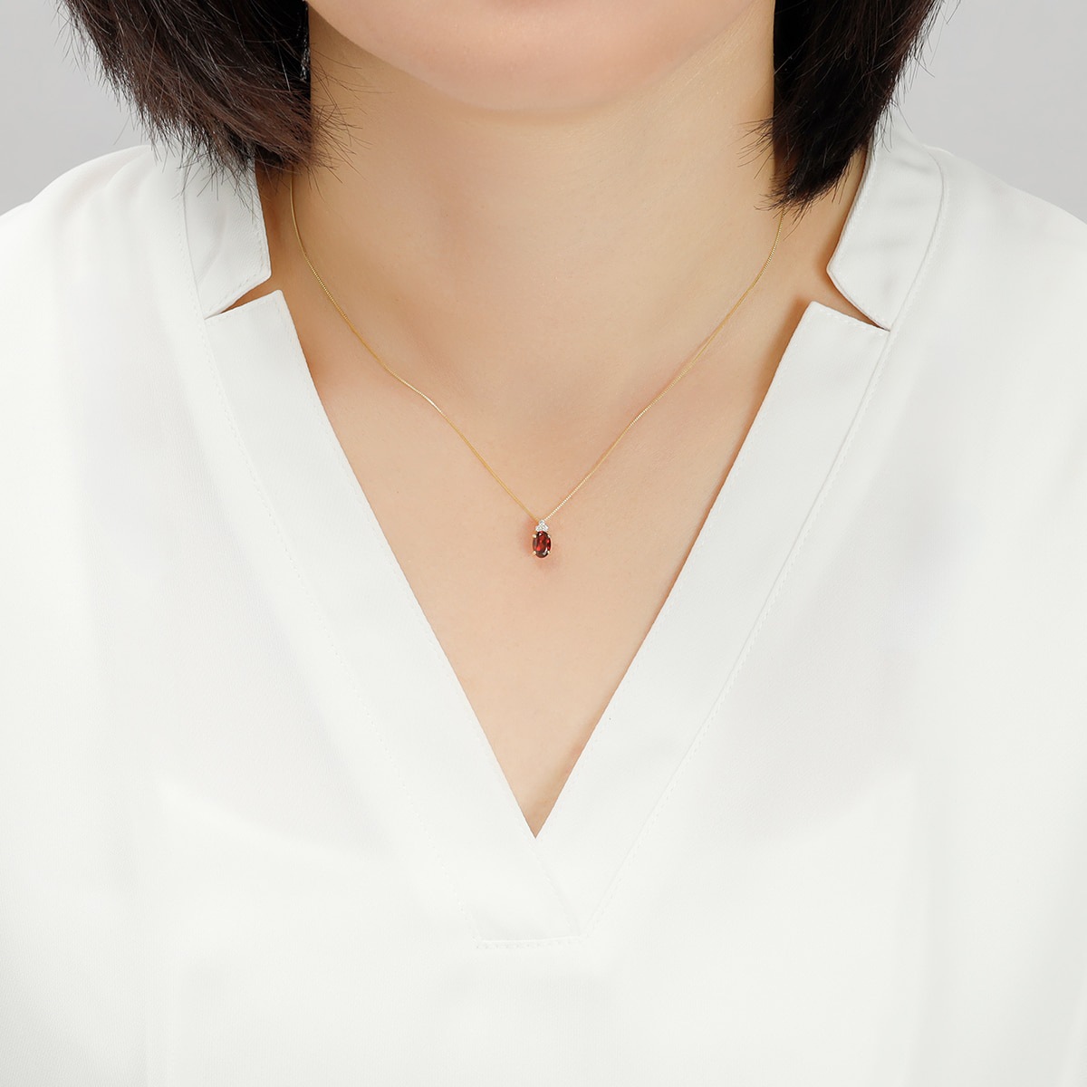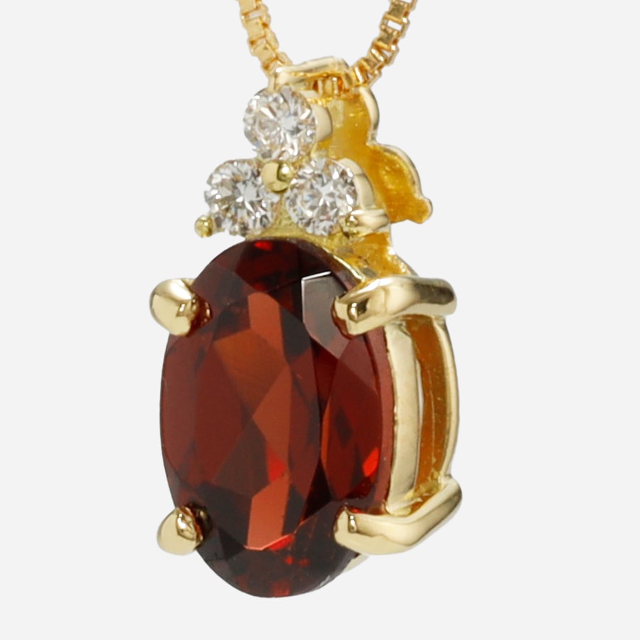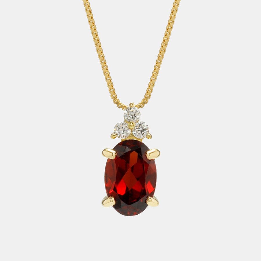 オーバルカットのガーネットを縦にセッティングすることで、すっきりとデコルテを彩ります。