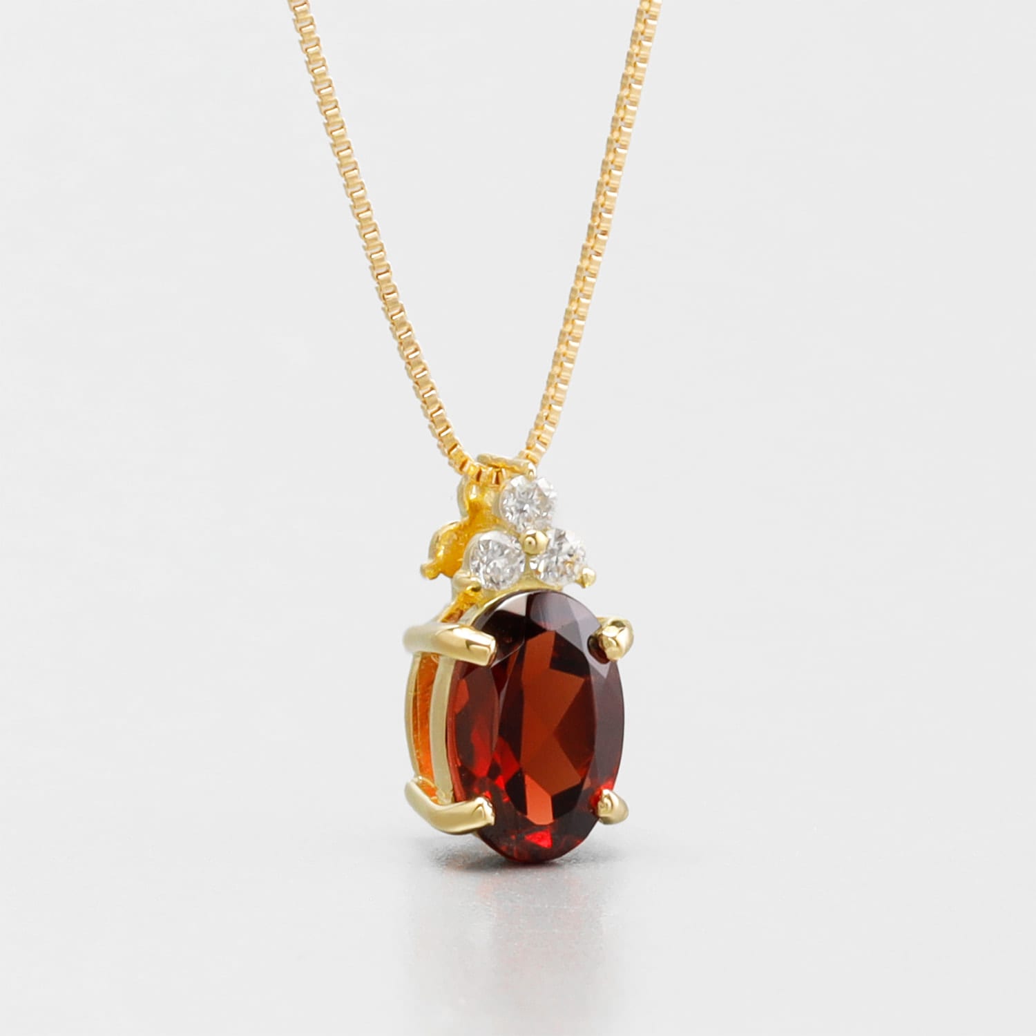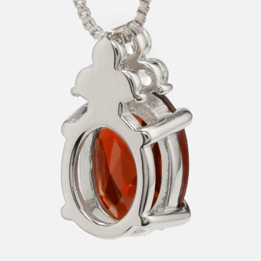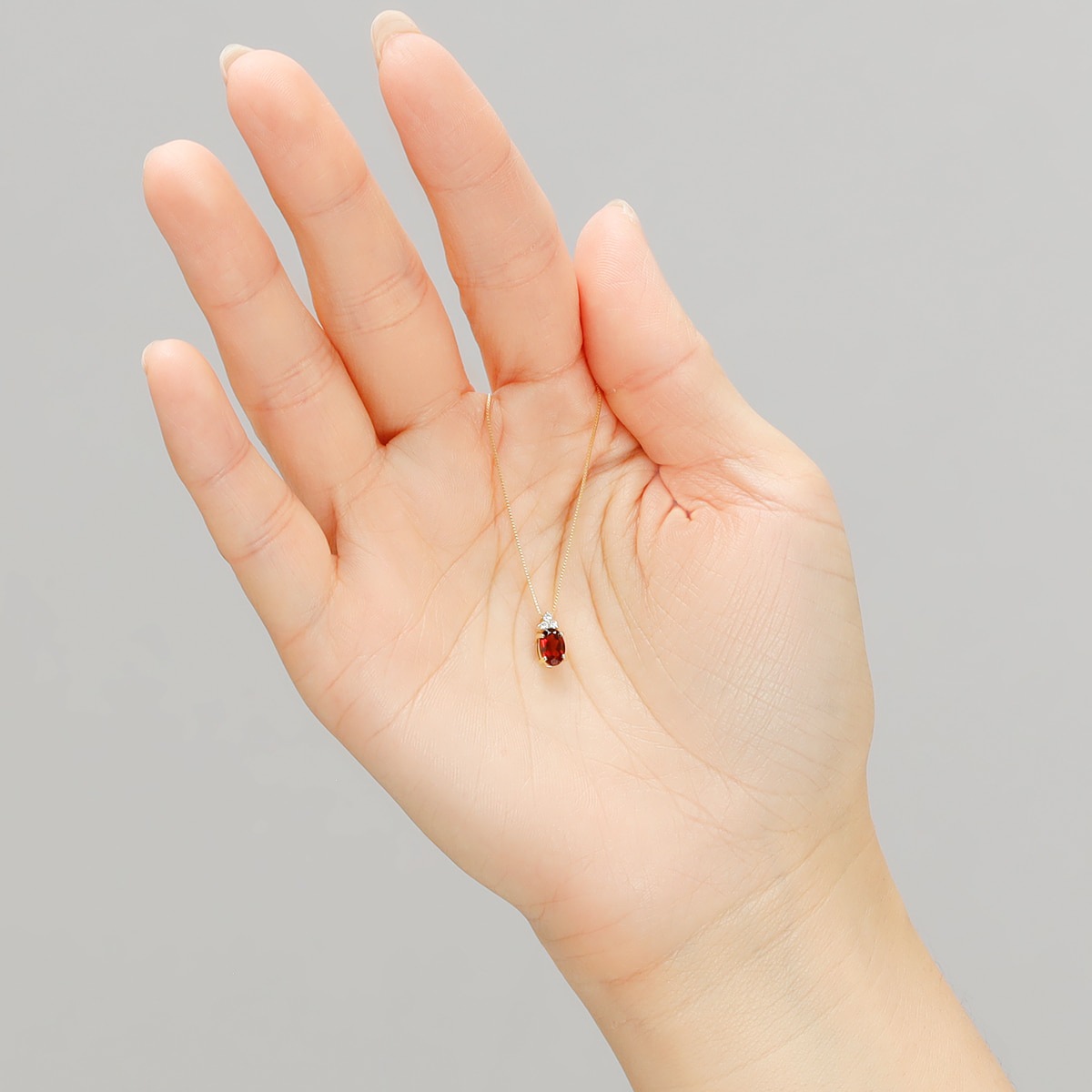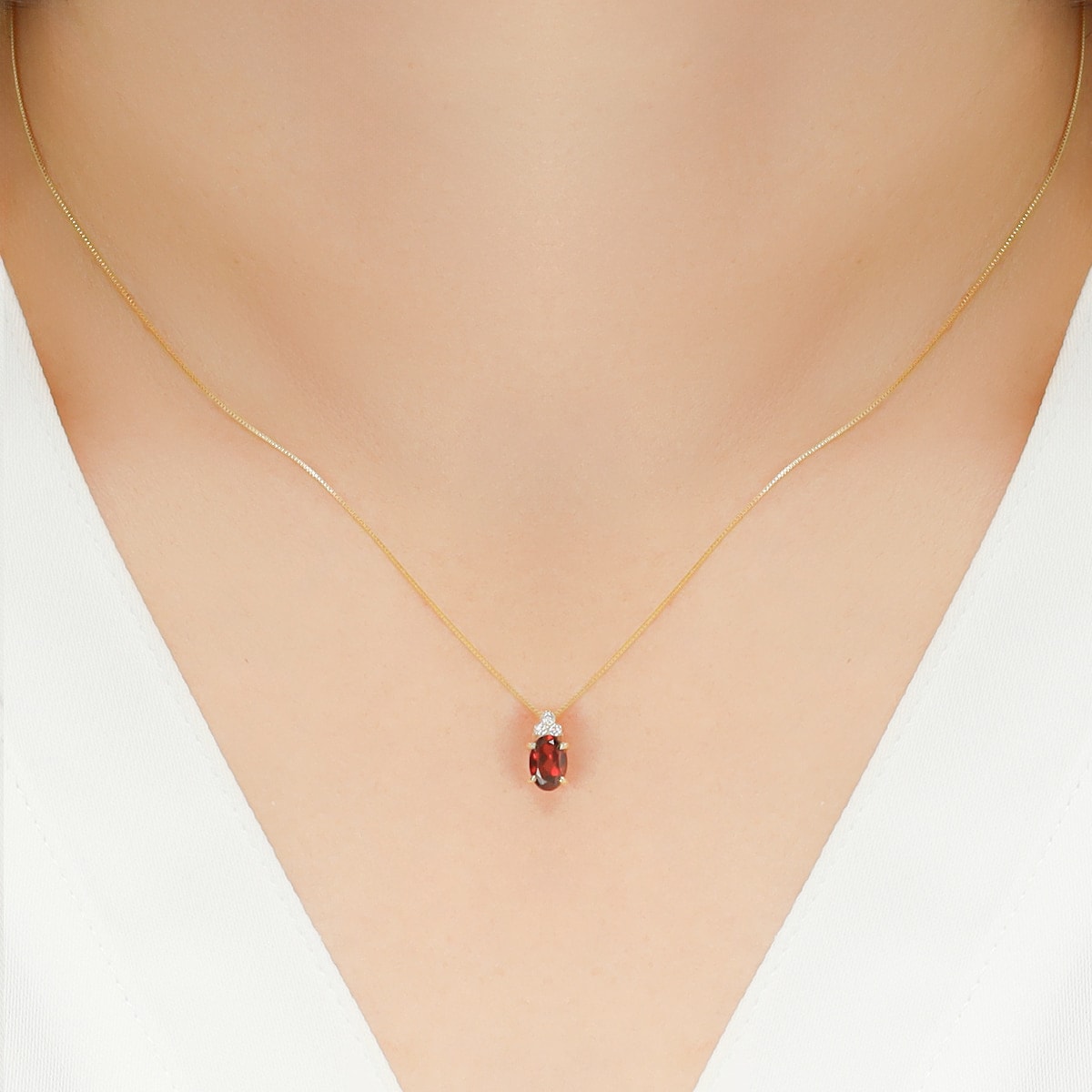 オーバルカットのガーネットを縦にセッティングすることで、すっきりとデコルテを彩ります。