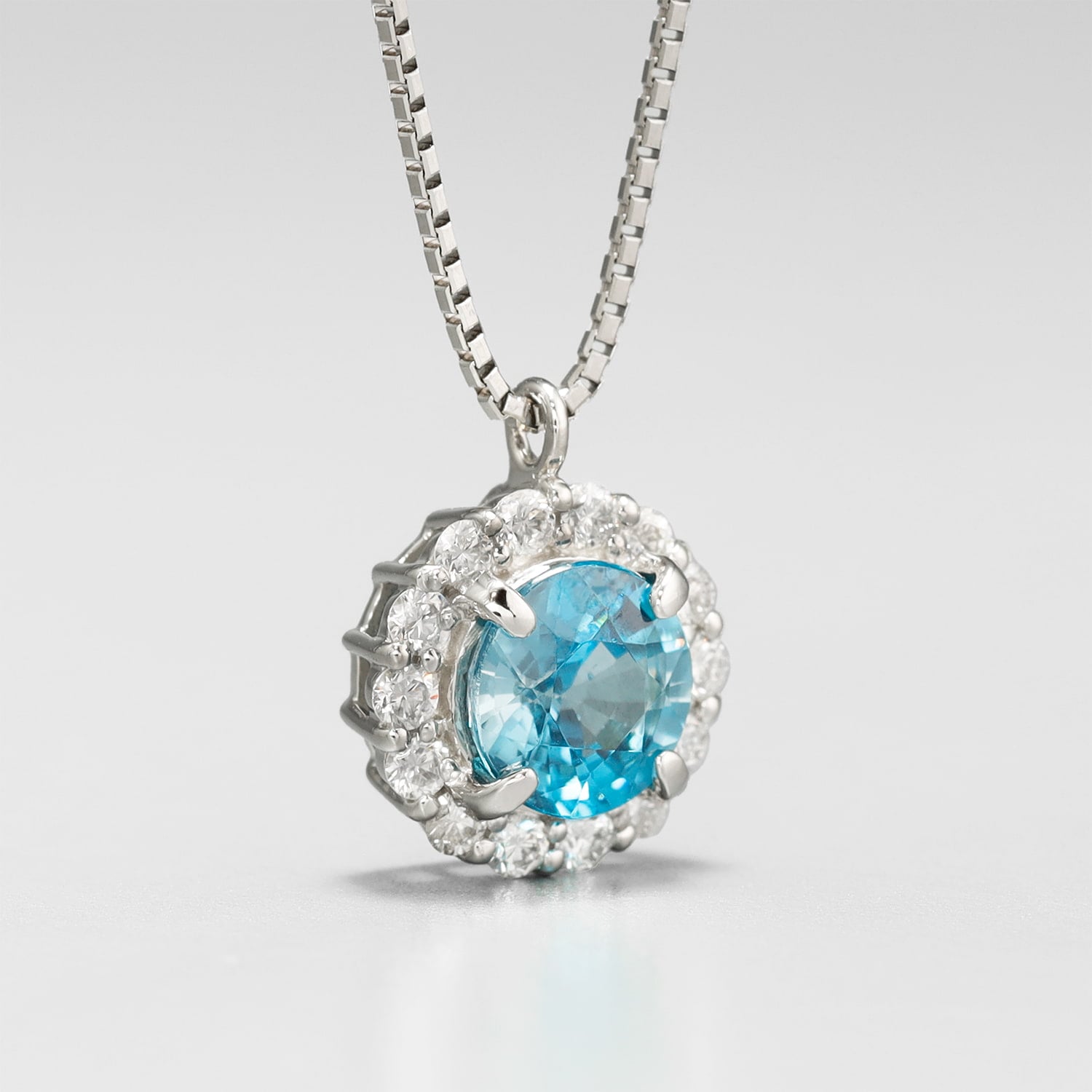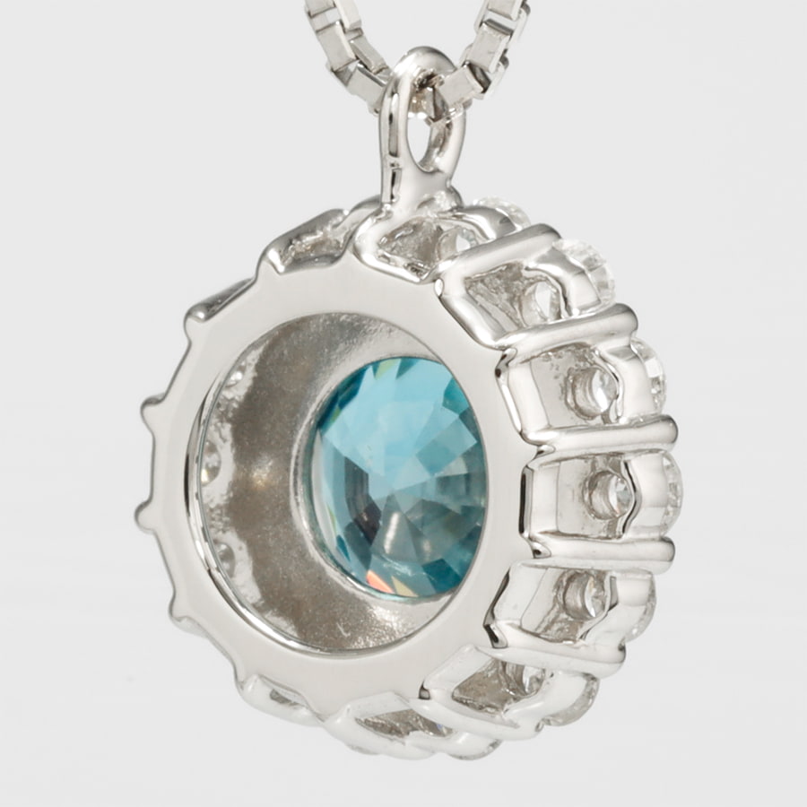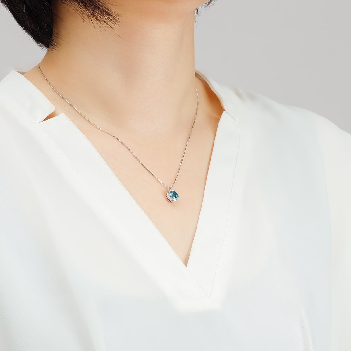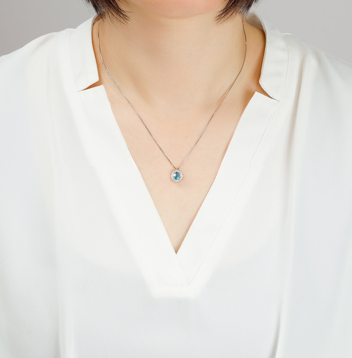小さなダイヤモンドで周りを取り巻くことで、中央のブルージルコンの美しさをより一層引き立て、胸元に気品ある輝きを添えます。職人が一石ずつ丁寧に留め、細部までこだわって仕上げられたジュエリーは、この先長くあなたに寄り添います。