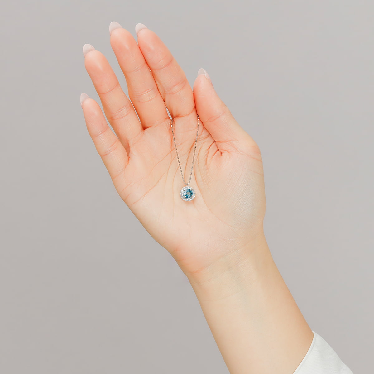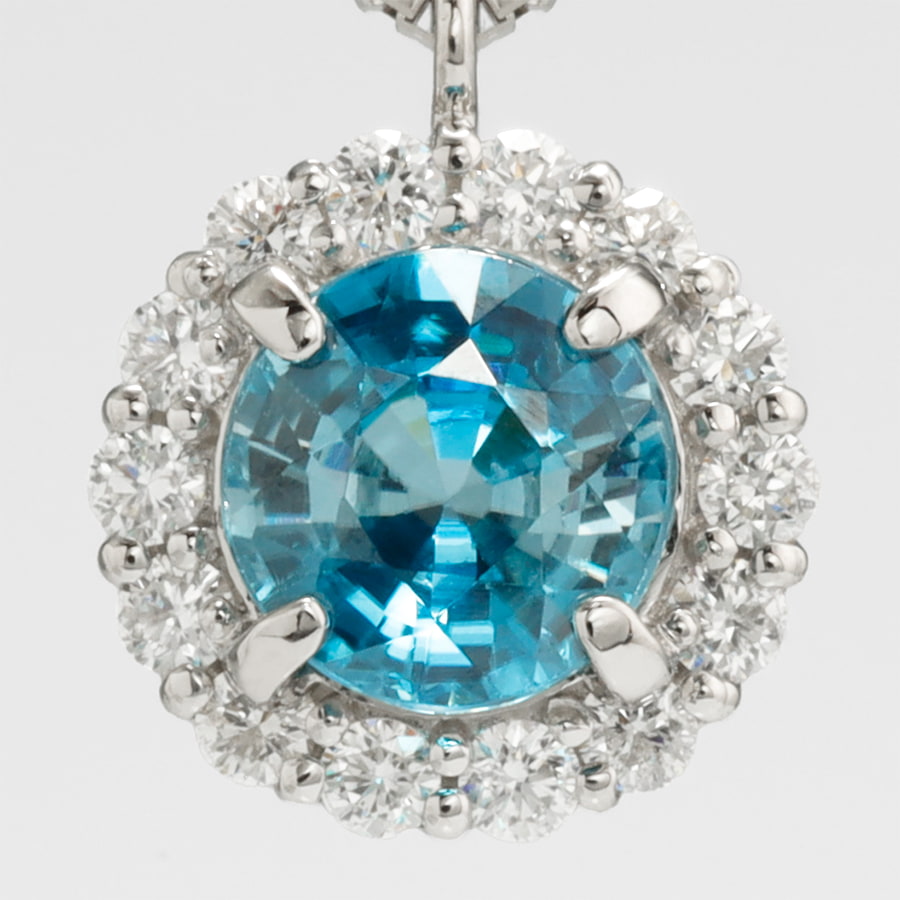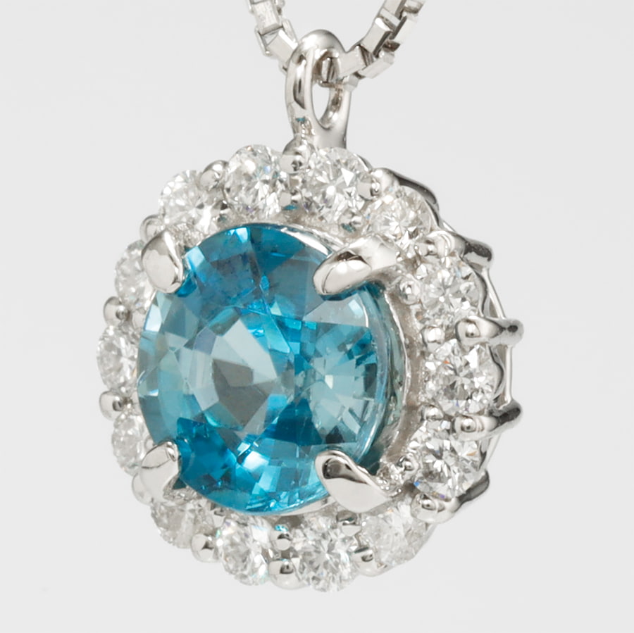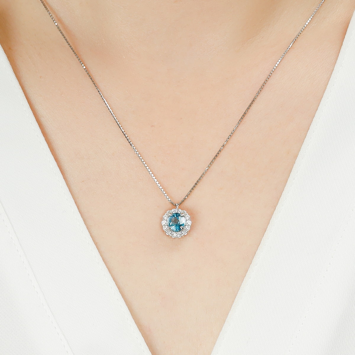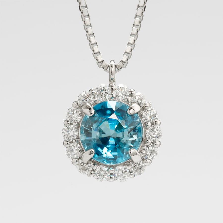 小さなダイヤモンドで周りを取り巻くことで、中央のブルージルコンの美しさをより一層引き立て、胸元に気品ある輝きを添えます。職人が一石ずつ丁寧に留め、細部までこだわって仕上げられたジュエリーは、この先長くあなたに寄り添います。